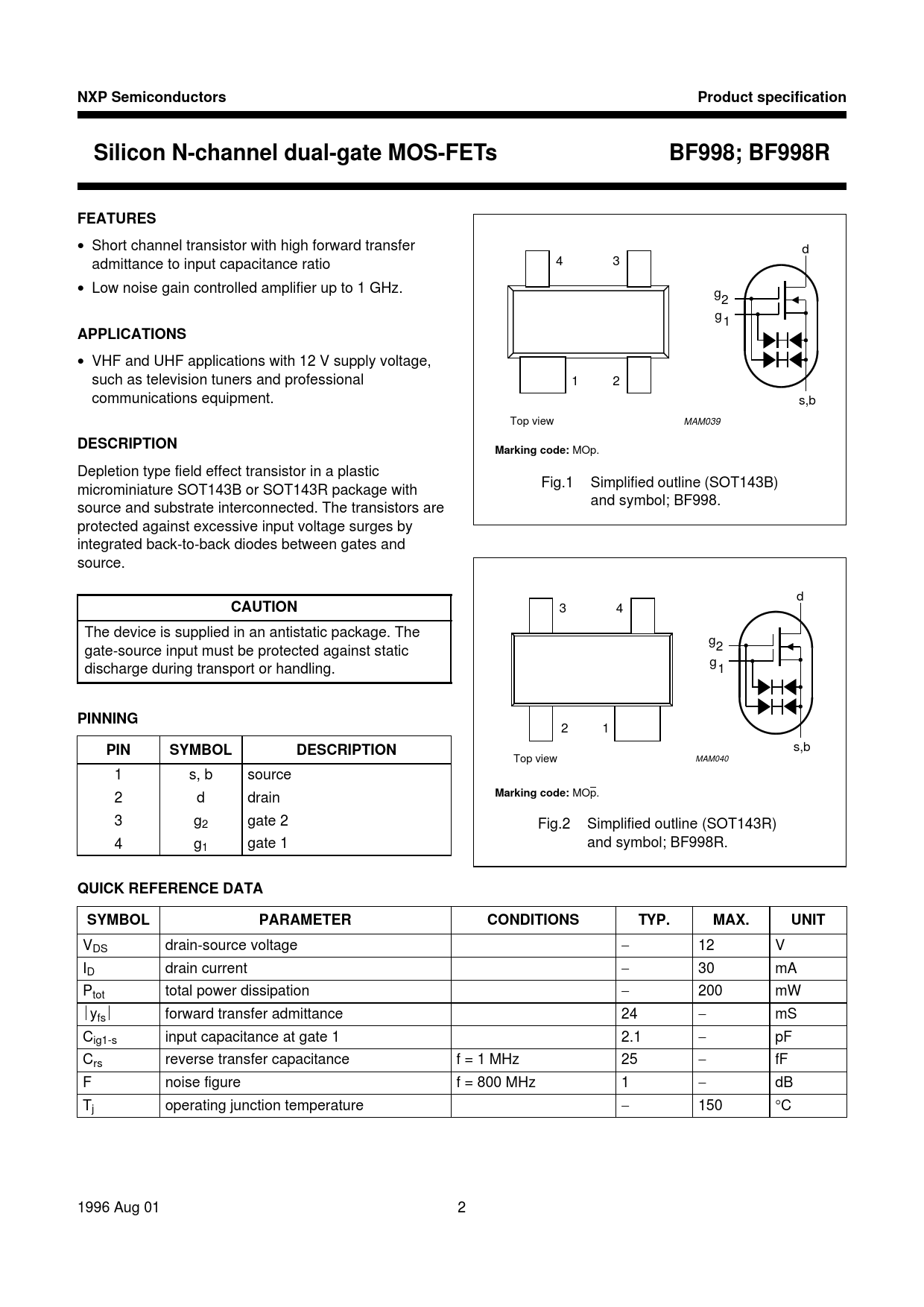 NXP SemiconductorsProduct specificationSilicon N-channel dual-gate MOS-FETsBF998; BF998RFEATURES Short channel transistor with high forward transfer handbook, halfpage d admittance to input capacitance ratio 4 3 Low noise gain controlled amplifier up to 1 GHz. g2 g1 APPLICATIONS VHF and UHF applications with 12 V supply voltage, such as television tuners and professional 1 2 communications equipment. s,b Top view MAM039 DESCRIPTIONMarking code: MOp. Depletion type field effect transistor in a plastic Fig.1 Simplified outline (SOT143B) microminiature SOT143B or SOT143R package with and symbol; BF998. source and substrate interconnected. The transistors are protected against excessive input voltage surges by integrated back-to-back diodes between gates and source. d CAUTION handbook, halfpage 3 4 The device is supplied in an antistatic package. The g gate-source input must be protected against static 2 g discharge during transport or handling. 1 PINNING 2 1 PINSYMBOLDESCRIPTION s,b Top view MAM040 1 s, b source 2 d drain Marking code: MOp. 3 g2 gate 2 Fig.2 Simplified outline (SOT143R) 4 g1 gate 1 and symbol; BF998R. QUICK REFERENCE DATASYMBOLPARAMETERCONDITIONSTYP.MAX.UNIT VDS drain-source voltage 12 V ID drain current 30 mA Ptot total power dissipation 200 mW y fs forward transfer admittance 24 mS Cig1-s input capacitance at gate 1 2.1 pF Crs reverse transfer capacitance f = 1 MHz 25 fF F noise figure f = 800 MHz 1 dB Tj operating junction temperature 150 C 1996 Aug 01 2 Document Outline Features Applications Description Pinning Quick reference data Limiting values Thermal characteristics Static characteristics Dynamic characteristics Package outlines Data sheet status Definitions Disclaimers