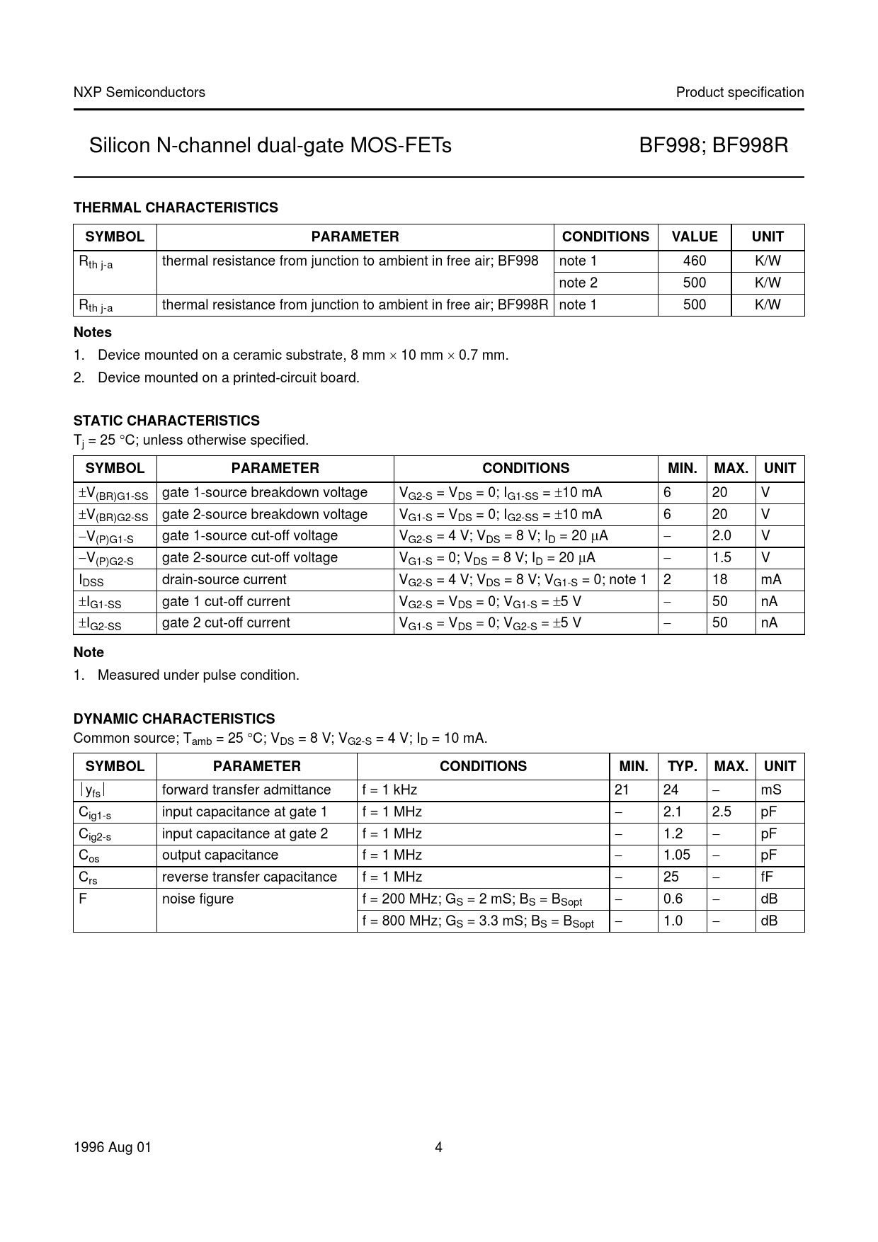 Rth j-a thermal resistance from junction to ambient in free air; BF998 note 1 460 K/W note 2 500 K/W Rth j-a thermal resistance from junction to ambient in free air; BF998R note 1 500 K/W