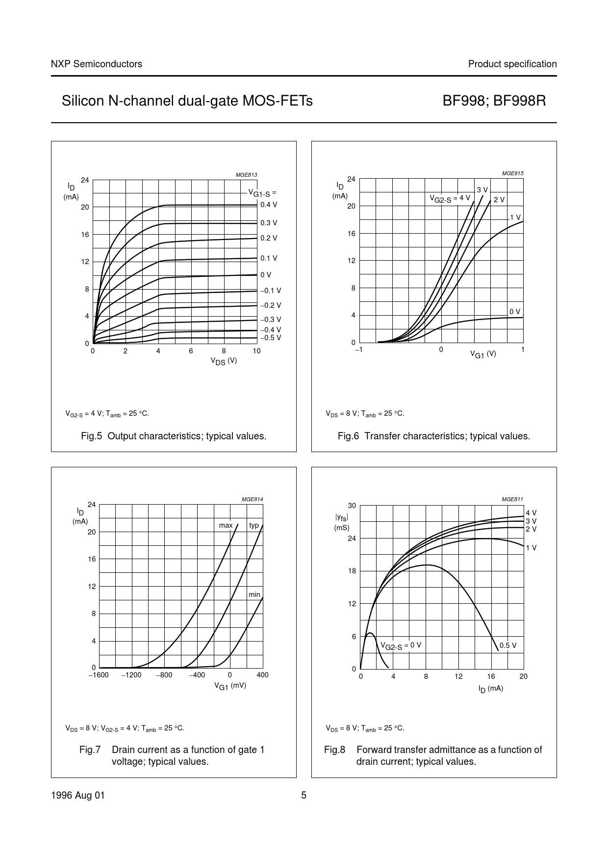 NXP Semiconductors Product specification Silicon N-channel dual-gate MOS-FETs BF998; BF998R MGE813 MGE815 24 24 handbook, halfpage I handbook, halfpage I D D V 3 V (mA) G1-S = (mA) VG2-S = 4 V 2 V 20 0.4 V 20 1 V 0.3 V 16 16 0.2 V 0.1 V 12 12 0 V 8 −0.1 V 8 −0.2 V 0 V 4 − 4 0.3 V −0.4 V −0.5 V 0 0 0 2 4 6 8 10 −1 0 1 VG1 (V) VDS (V) VG2-S = 4 V; Tamb = 25 C. VDS = 8 V; Tamb = 25 C. Fig.5 Output characteristics; typical values. Fig.6 Transfer characteristics; typical values. MGE814 MGE811 24 30 handbook, halfpage ID handbook, halfpage 4 V |y (mA) fs| 3 V max typ (mS) 20 2 V 24 1 V 16 18 12 min 12 8 6 4 V 0.5 V G2-S = 0 V 0 0 −1600 −1200 −800 −400 0 400 0 4 8 12 16 20 VG1 (mV) ID (mA) VDS = 8 V; VG2-S = 4 V; Tamb = 25 C. VDS = 8 V; Tamb = 25 C. Fig.7 Drain current as a function of gate 1 Fig.8 Forward transfer admittance as a function of voltage; typical values. drain current; typical values. 1996 Aug 01 5 Document Outline Features Applications Description Pinning Quick reference data Limiting values Thermal characteristics Static characteristics Dynamic characteristics Package outlines Data sheet status Definitions Disclaimers