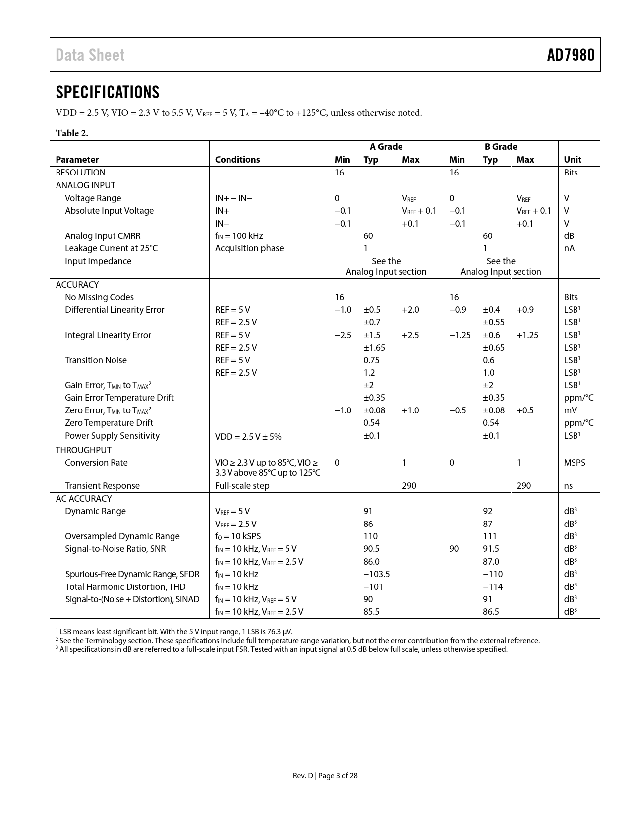 Data Sheet. AD7980. SPECIFICATIONS. Table 2. A Grade. B Grade. Parameter. Conditions. Min. Typ. Max. Unit