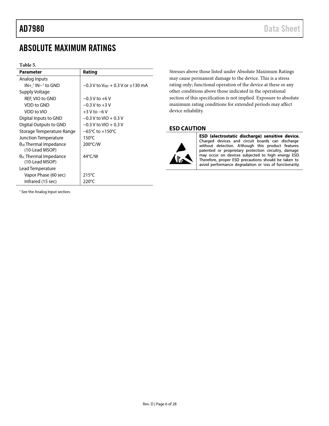 AD7980. Data Sheet. ABSOLUTE MAXIMUM RATINGS. Table 5. Parameter. Rating. ESD CAUTION