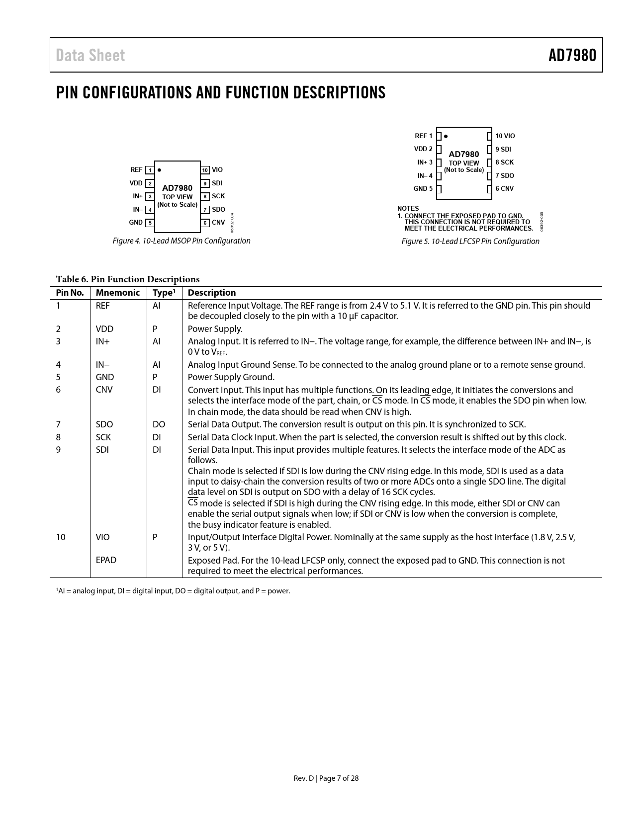 Data Sheet AD7980 PIN CONFIGURATIONS AND FUNCTION DESCRIPTIONS REF 1 10 VIO VDD 2 9 SDI IN+ 3 TOP VIEW 8 SCK (Not to Scale) IN– 4