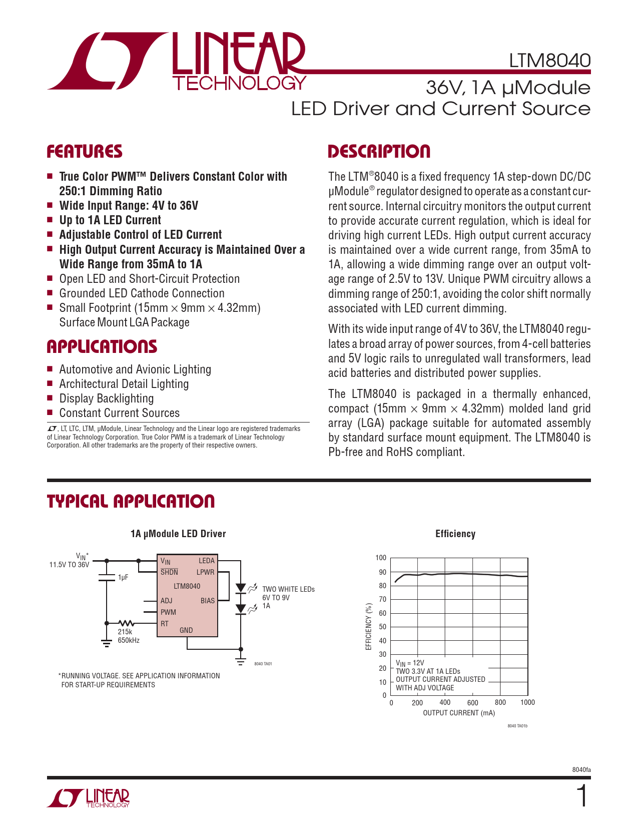 Description36V, 1A μModule (Power Module) LED Driver and Current Source