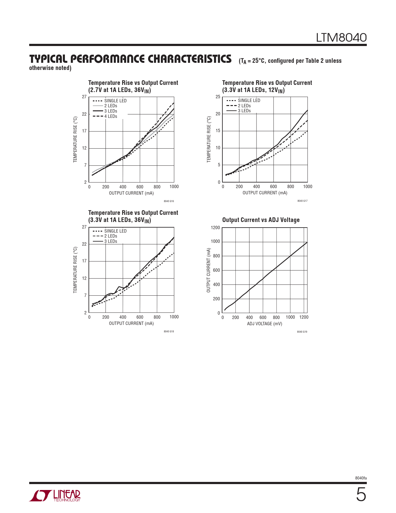 27 1200 SINGLE LED 2 LEDs 3 LEDs 1000 22 800 17 600 TURE RISE (°C) 12 400 TEMPERA OUTPUT CURRENT (mA) 7 200 2 0 0 200 400 600 800 1000 0 200 400 600 800 1000 1200 OUTPUT CURRENT (mA) ADJ VOLTAGE (mV) 8040 G18 8040 G19 8040fa 5