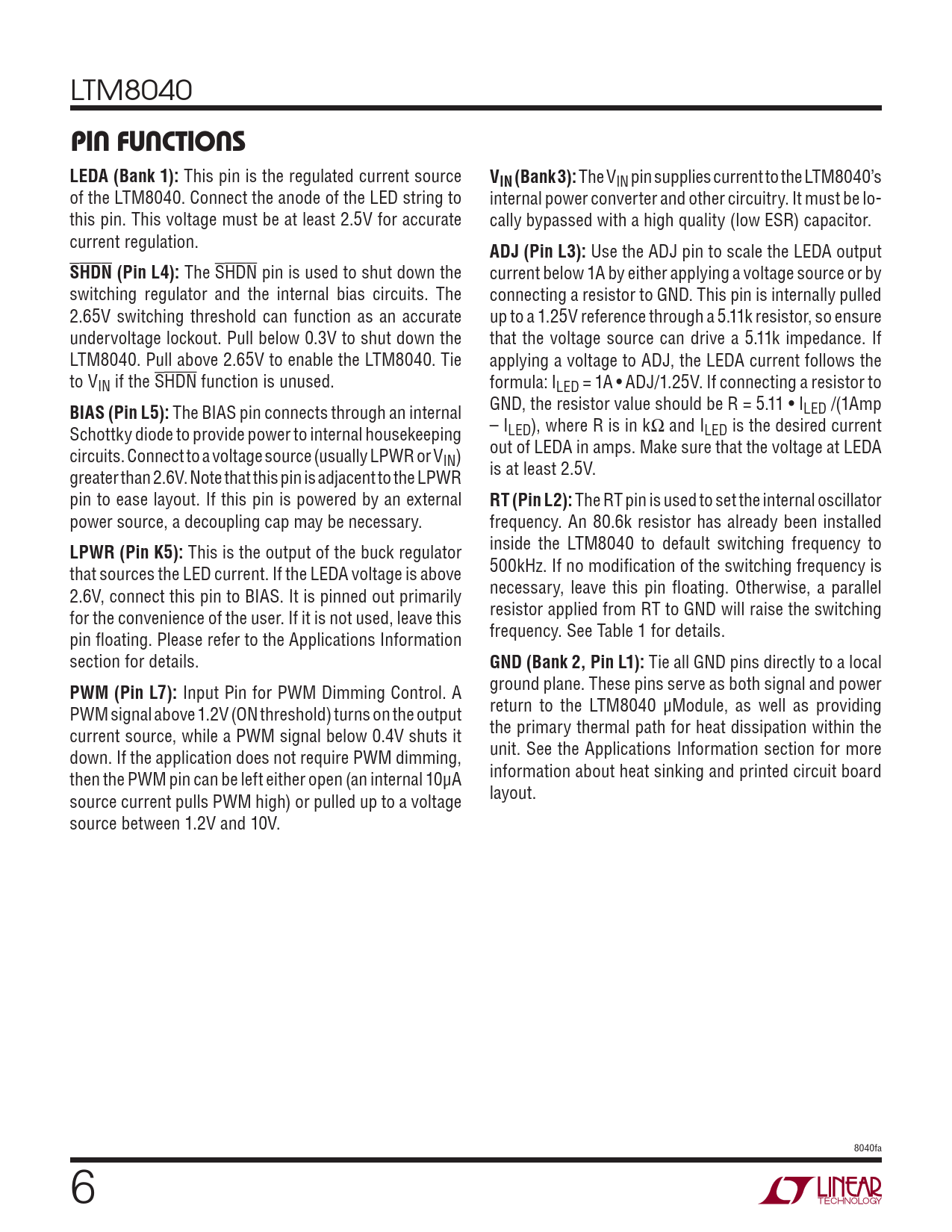 Pages / Page20 / 6 — PIN FUNCTIONS. LEDA (Bank 1):. VIN (Bank 3):. ADJ (Pin L3):. SHDN (Pin …