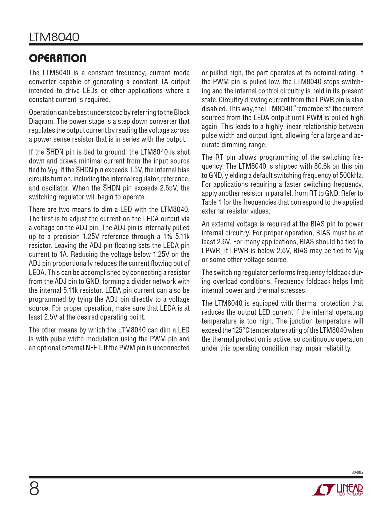The LTM8040 is a constant frequency, current mode or pulled high, the part operates at its nominal rating. If converter capable of generating a constant 1A output the PWM pin is pulled low, the LTM8040 stops switch- intended to drive LEDs or other applications where a ing and the internal control circuitry is held in its present constant current is required. state. Circuitry drawing current from the LPWR pin is also Operation can be best understood by referring to the Block disabled. This way, the LTM8040 “remembers” the current Diagram. The power stage is a step down converter that sourced from the LEDA output until PWM is pulled high regulates the output current by reading the voltage across again. This leads to a highly linear relationship between a power sense resistor that is in series with the output. pulse width and output light, allowing for a large and ac- curate dimming range. If the SHDN pin is tied to ground, the LTM8040 is shut down and draws minimal current from the input source The RT pin allows programming of the switching fre- tied to V quency. The LTM8040 is shipped with 80.6k on this pin IN. If the SHDN pin exceeds 1.5V, the internal bias circuits turn on, including the internal regulator, reference, to GND, yielding a default switching frequency of 500kHz. and oscillator. When the SHDN pin exceeds 2.65V, the For applications requiring a faster switching frequency, switching regulator will begin to operate. apply another resistor in parallel, from RT to GND. Refer to Table 1 for the frequencies that correspond to the applied There are two means to dim a LED with the LTM8040. external resistor values. The fi rst is to adjust the current on the LEDA output via a voltage on the ADJ pin. The ADJ pin is internally pulled An external voltage is required at the BIAS pin to power up to a precision 1.25V reference through a 1% 5.11k internal circuitry. For proper operation, BIAS must be at resistor. Leaving the ADJ pin fl oating sets the LEDA pin least 2.6V. For many applications, BIAS should be tied to current to 1A. Reducing the voltage below 1.25V on the LPWR; if LPWR is below 2.6V, BIAS may be tied to VIN ADJ pin proportionally reduces the current fl owing out of or some other voltage source. LEDA. This can be accomplished by connecting a resistor The switching regulator performs frequency foldback dur- from the ADJ pin to GND, forming a divider network with ing overload conditions. Frequency foldback helps limit the internal 5.11k resistor. LEDA pin current can also be internal power and thermal stresses. programmed by tying the ADJ pin directly to a voltage The LTM8040 is equipped with thermal protection that source. For proper operation, make sure that LEDA is at reduces the output LED current if the internal operating least 2.5V at the desired operating point. temperature is too high. The junction temperature will The other means by which the LTM8040 can dim a LED exceed the 125°C temperature rating of the LTM8040 when is with pulse width modulation using the PWM pin and the thermal protection is active, so continuous operation an optional external NFET. If the PWM pin is unconnected under this operating condition may impair reliability. 8040fa 8