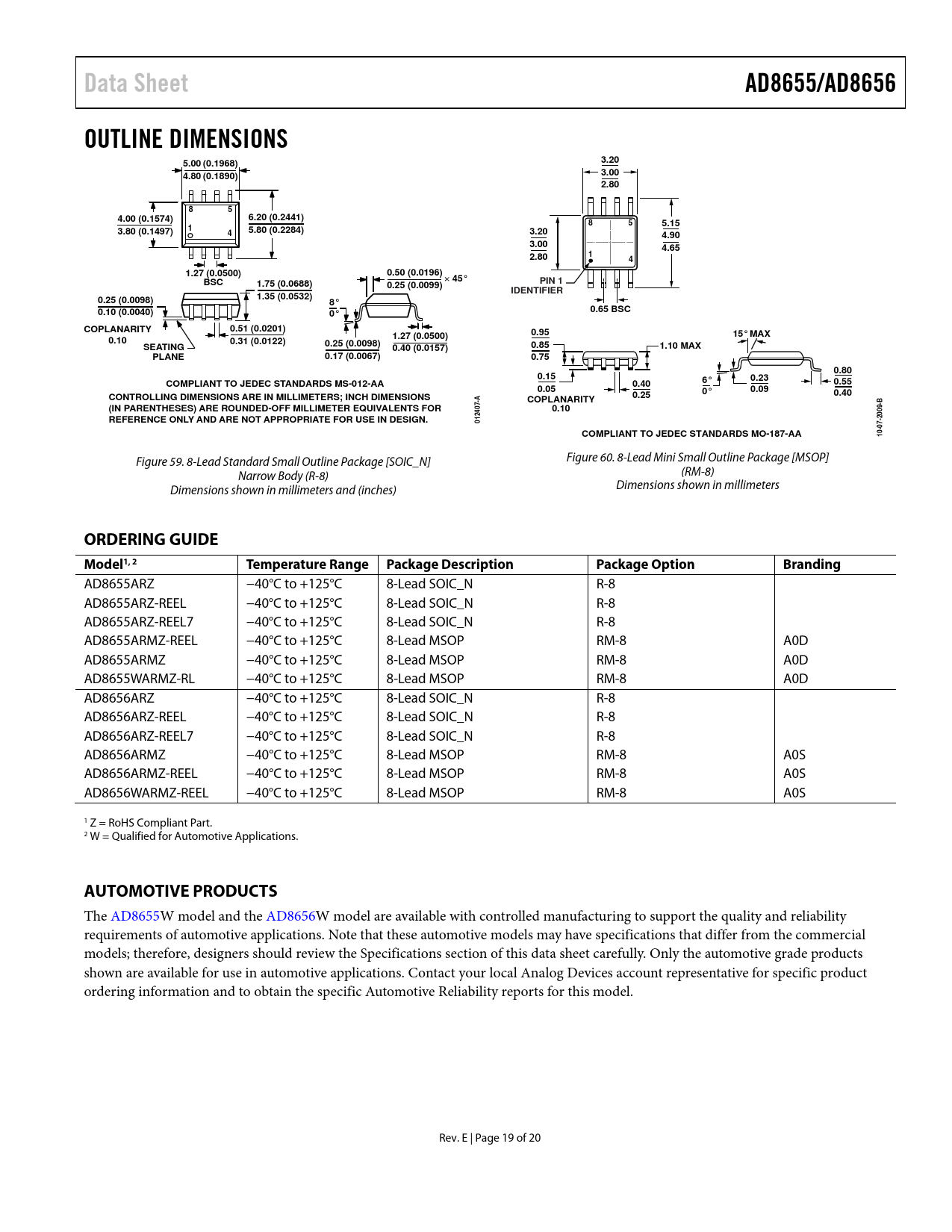 link to page 3 link to page 19 link to page 19 Data SheetAD8655/AD8656OUTLINE DIMENSIONS5.00 (0.1968)3.204.80 (0.1890)3.00 2.80854.00 (0.1574)6.20 (0.2441)855.1513.80 (0.1497)5.80 (0.2284)43.204.903.004.6512.8041.27 (0.0500)0.50 (0.0196)45°BSC1.75 (0.0688)0.25 (0.0099)PIN 1IDENTIFIER1.35 (0.0532)0.25 (0.0098)8°0.10 (0.0040)0.65 BSC0°COPLANARITY0.51 (0.0201)1.27 (0.0500)0.9515° MAX0.100.31 (0.0122)0.25 (0.0098)SEATING0.40 (0.0157)0.851.10 MAXPLANE0.17 (0.0067)0.750.800.150.23COMPLIANT TO JEDEC STANDARDS MS-012-AA6°0.550.400.050°0.090.40CONTROLLING DIMENSIONS ARE IN MILLIMETERS; INCH DIMENSIONS0.25-ACOPLANARITY(IN PARENTHESES) ARE ROUNDED-OFF MILLIMETER EQUIVALENTS FOR0.109-B2407REFERENCE ONLY AND ARE NOT APPROPRIATE FOR USE IN DESIGN.01-200COMPLIANT TO JEDEC STANDARDS MO-187-AA0-07 1 Figure 59. 8-Lead Standard Small Outline Package [SOIC_N] Figure 60. 8-Lead Mini Small Outline Package [MSOP] Narrow Body (R-8) (RM-8) Dimensions shown in millimeters and (inches) Dimensions shown in millimeters ORDERING GUIDEModel1, 2Temperature RangePackage DescriptionPackage OptionBranding AD8655ARZ −40°C to +125°C 8-Lead SOIC_N R-8 AD8655ARZ-REEL −40°C to +125°C 8-Lead SOIC_N R-8 AD8655ARZ-REEL7 −40°C to +125°C 8-Lead SOIC_N R-8 AD8655ARMZ-REEL −40°C to +125°C 8-Lead MSOP RM-8 A0D AD8655ARMZ −40°C to +125°C 8-Lead MSOP RM-8 A0D AD8655WARMZ-RL −40°C to +125°C 8-Lead MSOP RM-8 A0D AD8656ARZ −40°C to +125°C 8-Lead SOIC_N R-8 AD8656ARZ-REEL −40°C to +125°C 8-Lead SOIC_N R-8 AD8656ARZ-REEL7 −40°C to +125°C 8-Lead SOIC_N R-8 AD8656ARMZ −40°C to +125°C 8-Lead MSOP RM-8 A0S AD8656ARMZ-REEL −40°C to +125°C 8-Lead MSOP RM-8 A0S AD8656WARMZ-REEL −40°C to +125°C 8-Lead MSOP RM-8 A0S 1 Z = RoHS Compliant Part. 2 W = Qualified for Automotive Applications. AUTOMOTIVE PRODUCTS The AD8655W model and the AD8656W model are available with controlled manufacturing to support the quality and reliability requirements of automotive applications. Note that these automotive models may have specifications that differ from the commercial models; therefore, designers should review the Specifications section of this data sheet carefully. Only the automotive grade products shown are available for use in automotive applications. Contact your local Analog Devices account representative for specific product ordering information and to obtain the specific Automotive Reliability reports for this model. Rev. E | Page 19 of 20 Document Outline Features Applications Pin Configurations General Description Table of Contents Revision History Specifications Absolute Maximum Ratings ESD Caution Typical Performance Characteristics Theory of Operation Applications Information Input Overvoltage Protection Input Capacitance Driving Capacitive Loads THD Readings vs. Common-Mode Voltage Layout, Grounding, and Bypassing Considerations Power Supply Bypassing Grounding Leakage Currents Outline Dimensions Ordering Guide Automotive Products