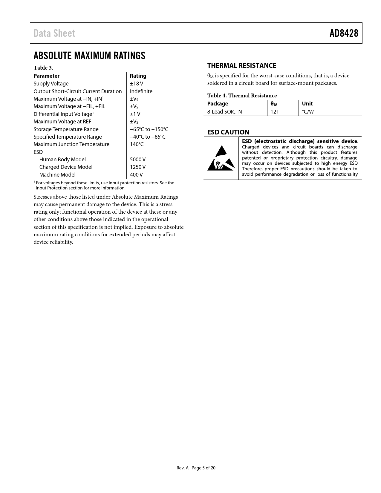 Pages / Page20 / 5 — Data Sheet. AD8428. ABSOLUTE MAXIMUM RATINGS Table 3. THERMAL RESISTANCE. …