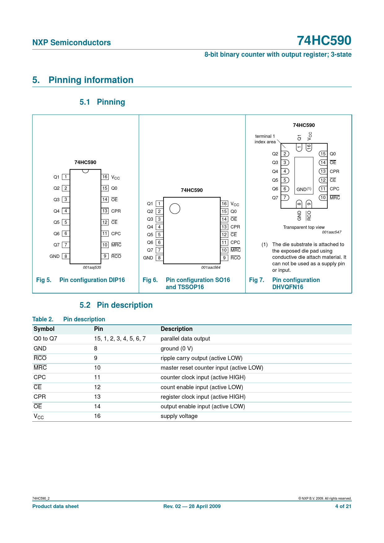 NXP Semiconductors. 74HC590. 8-bit binary counter with output register; 3-state. Pinning information. 5.1 Pinning. Fig 5