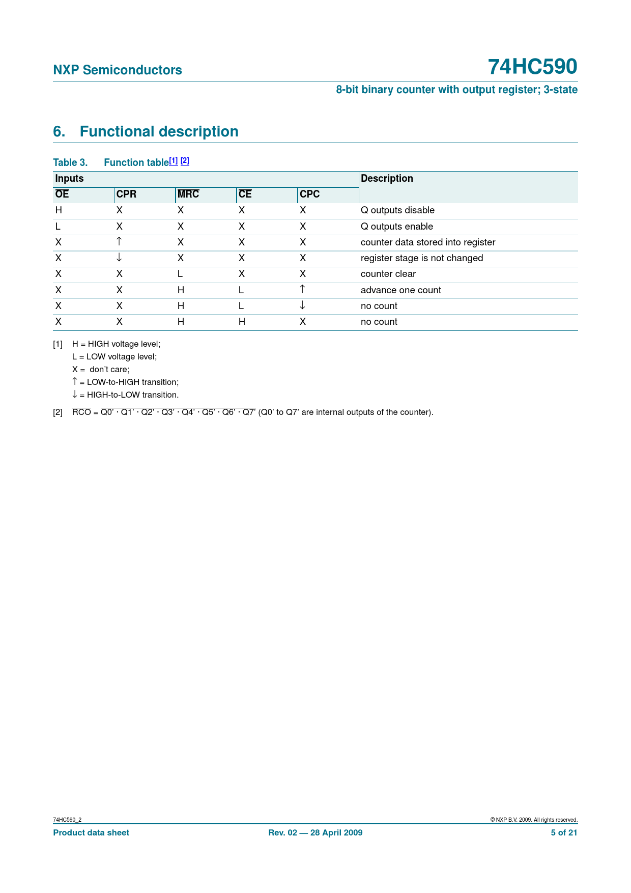 NXP Semiconductors. 74HC590. 8-bit binary counter with output register; 3-state. Functional description. Table 3