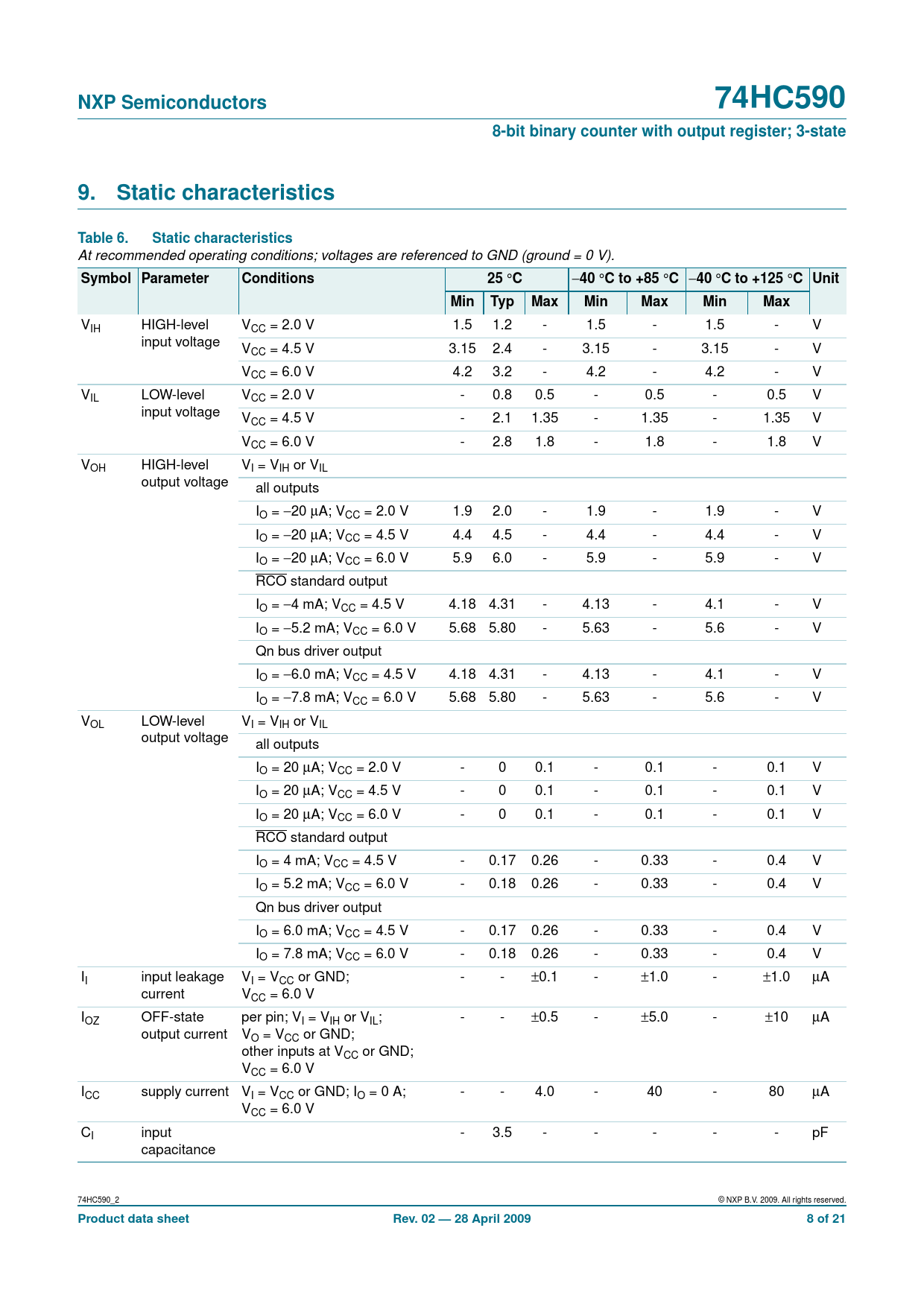 NXP Semiconductors. 74HC590. 8-bit binary counter with output register; 3-state. Static characteristics. Table 6
