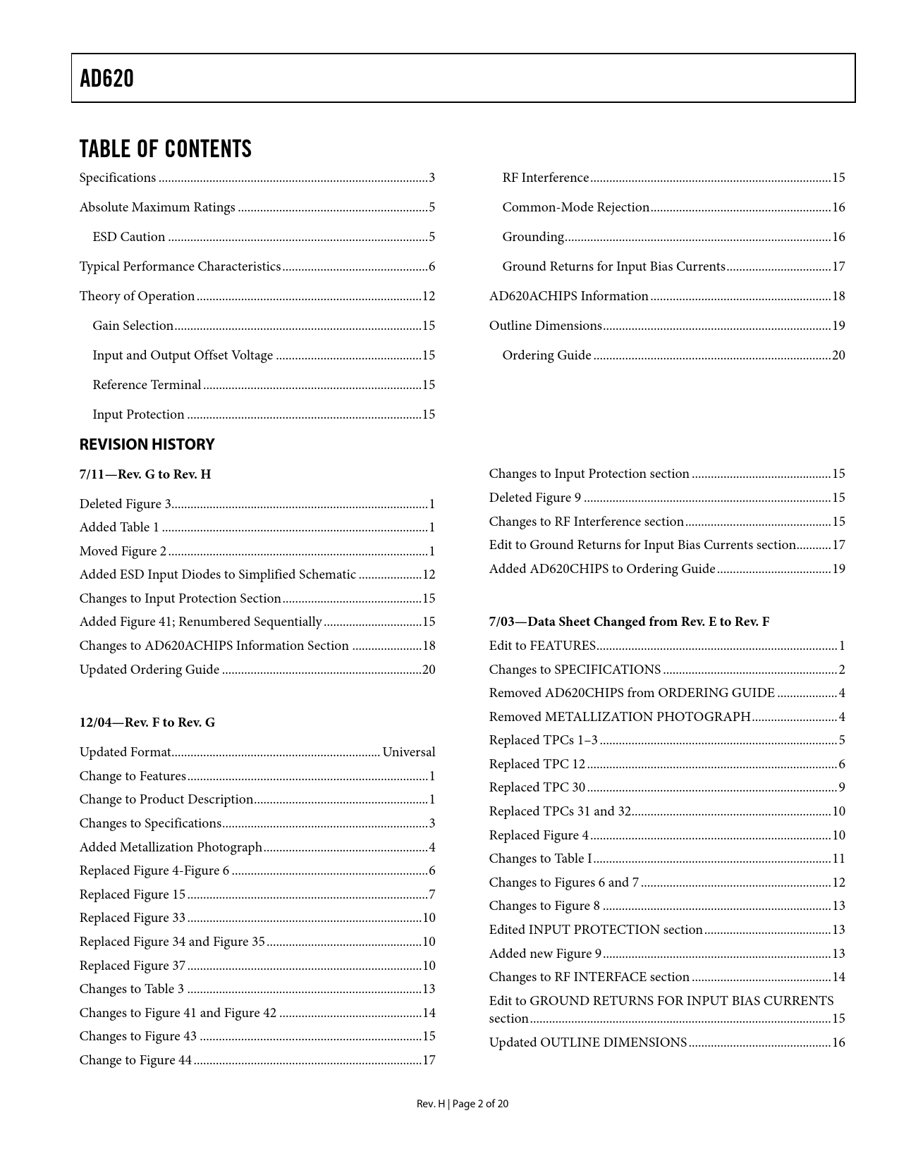 Pages / Page20 / 2 — AD620. TABLE OF CONTENTS. REVISION HISTORY. 7/11—Rev. G to Rev. H. …