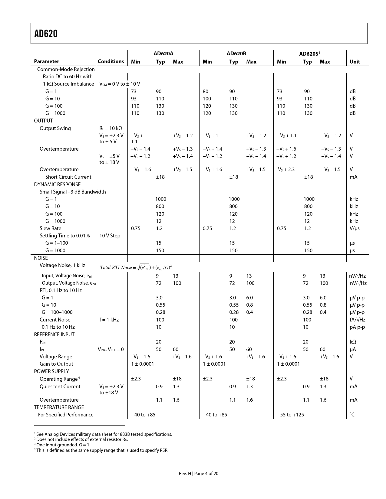 Pages / Page20 / 4 — AD620. AD620A AD620B AD620S1. Parameter Conditions. Min. Typ. Max. Unit