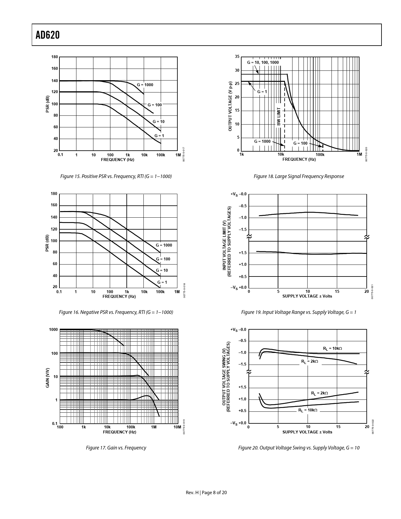AD620 180 35 G = 10, 100, 1000 160 30 140 G = 1000 25 120 G = 1 B) 20 d 100 G = 100 PSR ( 15 80 LIMIT G = 10 10 BW 60 OUTPUT VOLTAGE (V p-p) G = 1 40 5 G = 1000 G = 100 20 0 0.1 1 10 100 1k 10k 100k 1M 1k 10k 100k 1M FREQUENCY (Hz) FREQUENCY (Hz)