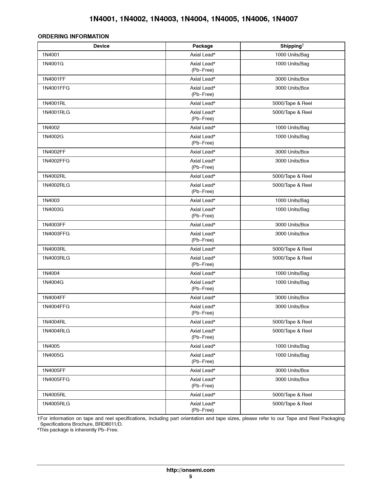 1N4001, 1N4002, 1N4003, 1N4004, 1N4005, 1N4006, 1N4007. ORDERING INFORMATION. Device. Package. Shipping. http://onsemi.com