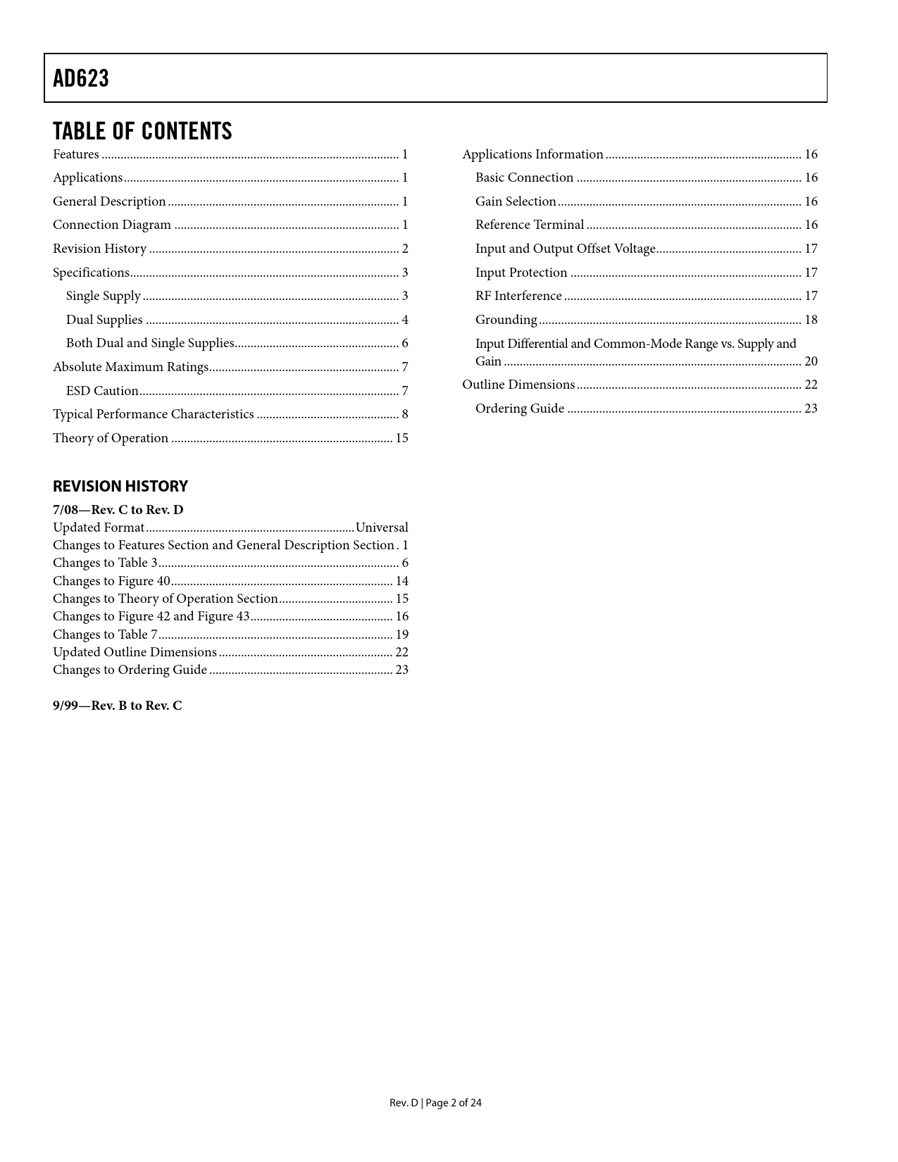 link to page 1 link to page 1 link to page 1 link to page 1 link to page 2 link to page 3 link to page 3 link to page 4 link to page 6 link to page 7 link to page 7 link to page 8 link to page 15 link to page 16 link to page 16 link to page 16 link to page 16 link to page 17 link to page 17 link to page 17 link to page 18 link to page 20 link to page 20 link to page 22 link to page 23 AD623TABLE OF CONTENTS Features .. 1 Applications Information .. 16 Applications ... 1 Basic Connection ... 16 General Description ... 1 Gain Selection ... 16 Connection Diagram ... 1 Reference Terminal .. 16 Revision History ... 2 Input and Output Offset Voltage .. 17 Specifications ... 3 Input Protection ... 17 Single Supply ... 3 RF Interference ... 17 Dual Supplies .. 4 Grounding ... 18 Both Dual and Single Supplies .. 6 Input Differential and Common-Mode Range vs. Supply and Absolute Maximum Ratings .. 7 Gain .. 20 ESD Caution .. 7 Outline Dimensions ... 22 Typical Performance Characteristics ... 8 Ordering Guide .. 23 Theory of Operation .. 15 REVISION HISTORY7/08—Rev. C to Rev. D Updated Format .. Universal Changes to Features Section and General Description Section . 1 Changes to Table 3 .. 6 Changes to Figure 40 .. 14 Changes to Theory of Operation Section .. 15 Changes to Figure 42 and Figure 43 ... 16 Changes to Table 7 .. 19 Updated Outline Dimensions ... 22 Changes to Ordering Guide .. 23 9/99—Rev. B to Rev. C Rev. D | Page 2 of 24 Document Outline FEATURES APPLICATIONS GENERAL DESCRIPTION CONNECTION DIAGRAM TABLE OF CONTENTS REVISION HISTORY SPECIFICATIONS SINGLE SUPPLY DUAL SUPPLIES BOTH DUAL AND SINGLE SUPPLIES ABSOLUTE MAXIMUM RATINGS ESD CAUTION TYPICAL PERFORMANCE CHARACTERISTICS THEORY OF OPERATION APPLICATIONS INFORMATION BASIC CONNECTION GAIN SELECTION REFERENCE TERMINAL INPUT AND OUTPUT OFFSET VOLTAGE INPUT PROTECTION RF INTERFERENCE GROUNDING Ground Returns for Input Bias Currents Output Buffering Single-Supply Data Acquisition System Amplifying Signals with Low Common-Mode Voltage INPUT DIFFERENTIAL AND COMMON-MODE RANGE vs. SUPPLY AND GAIN OUTLINE DIMENSIONS ORDERING GUIDE