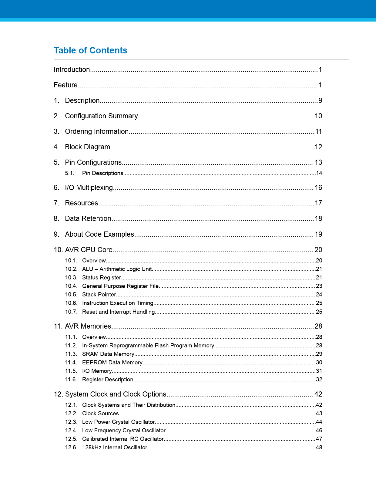 Introduction..1 Feature.. 1 1. Description...9 2. Configuration Summary... 10 3. Ordering Information.. 11 4. Block Diagram... 12 5. Pin Configurations... 13 5.1. Pin Descriptions..14 6. I/O Multiplexing.. 16 7. Resources..17 8. Data Retention...18 9. About Code Examples... 19 10. AVR CPU Core.. 20 10.1. Overview...20 10.2. ALU – Arithmetic Logic Unit..21 10.3. Status Register...21 10.4. General Purpose Register File... 23 10.5. Stack Pointer.. 24 10.6. Instruction Execution Timing.. 25 10.7. Reset and Interrupt Handling... 25 11. AVR Memories...28 11.1. Overview...28 11.2. In-System Reprogrammable Flash Program Memory..28 11.3. SRAM Data Memory...29 11.4. EEPROM Data Memory... 30 11.5. I/O Memory...31 11.6. Register Description... 32 12. System Clock and Clock Options.. 42 12.1. Clock Systems and Their Distribution...42 12.2. Clock Sources.. 43 12.3. Low Power Crystal Oscillator..44 12.4. Low Frequency Crystal Oscillator...46 12.5. Calibrated Internal RC Oscillator..47 12.6. 128kHz Internal Oscillator.. 48 Document Outline Introduction Feature Table of Contents 1. Description 2. Configuration Summary 3. Ordering Information 4. Block Diagram 5. Pin Configurations 5.1. Pin Descriptions 5.1.1. VCC 5.1.2. GND 5.1.3. Port B (PB[7:0]) XTAL1/XTAL2/TOSC1/TOSC2 5.1.4. Port C (PC[5:0]) 5.1.5. PC6/RESET 5.1.6. Port D (PD[7:0]) 5.1.7. Port E (PE[3:0]) 5.1.8. AVCC 5.1.9. AREF 5.1.10. ADC[7:6] (TQFP and VFQFN Package Only) 6. I/O Multiplexing 7. Resources 8. Data Retention 9. About Code Examples 10. AVR CPU Core 10.1. Overview 10.2. ALU – Arithmetic Logic Unit 10.3. Status Register 10.3.1. Status Register 10.4. General Purpose Register File 10.4.1. The X-register, Y-register, and Z-register 10.5. Stack Pointer 10.5.1. SPH and SPL - Stack Pointer High and Stack Pointer Low Register 10.6. Instruction Execution Timing 10.7. Reset and Interrupt Handling 10.7.1. Interrupt Response Time 11. AVR Memories 11.1. Overview 11.2. In-System Reprogrammable Flash Program Memory 11.3. SRAM Data Memory 11.3.1. Data Memory Access Times 11.4. EEPROM Data Memory 11.4.1. EEPROM Read/Write Access 11.4.2. Preventing EEPROM Corruption 11.5. I/O Memory 11.5.1. General Purpose I/O Registers 11.6. Register Description 11.6.1. EEPROM Address Register High 11.6.2. EEPROM Address Register Low 11.6.3. EEPROM Data Register 11.6.4. EEPROM Control Register 11.6.5. GPIOR2 – General Purpose I/O Register 2 11.6.6. GPIOR1 – General Purpose I/O Register 1 11.6.7. GPIOR0 – General Purpose I/O Register 0 12. System Clock and Clock Options 12.1. Clock Systems and Their Distribution 12.1.1. CPU Clock – clkCPU 12.1.2. I/O Clock – clkI/O 12.1.3. PTC Clock - clkPTC 12.1.4. Flash Clock – clkFLASH 12.1.5. Asynchronous Timer Clock – clkASY 12.1.6. ADC Clock – clkADC 12.2. Clock Sources 12.2.1. Default Clock Source 12.2.2. Clock Startup Sequence 12.3. Low Power Crystal Oscillator 12.4. Low Frequency Crystal Oscillator 12.5. Calibrated Internal RC Oscillator 12.6. 128kHz Internal Oscillator 12.7. External Clock 12.8. Clock Output Buffer 12.9. Timer/Counter Oscillator 12.10. System Clock Prescaler 12.11. Register Description 12.11.1. Oscillator Calibration Register 12.11.2. Clock Prescaler Register 13. CFD - Clock Failure Detection mechanism 13.1. Overview 13.2. Features 13.3. Operations 13.4. Timing Diagram 13.5. Register Description 13.5.1. XOSC Failure Detection Control And Status Register 14. PM - Power Management and Sleep Modes 14.1. Sleep Modes 14.2. BOD Disable 14.3. Idle Mode 14.4. ADC Noise Reduction Mode 14.5. Power-Down Mode 14.6. Power-save Mode 14.7. Standby Mode 14.8. Extended Standby Mode 14.9. Power Reduction Register 14.10. Minimizing Power Consumption 14.10.1. Analog to Digital Converter 14.10.2. Analog Comparator 14.10.3. Brown-Out Detector 14.10.4. Internal Voltage Reference 14.10.5. Watchdog Timer 14.10.6. Port Pins 14.10.7. On-chip Debug System 14.11. Register Description 14.11.1. Sleep Mode Control Register 14.11.2. MCU Control Register 14.11.3. Power Reduction Register 0 15. SCRST - System Control and Reset 15.1. Resetting the AVR 15.2. Reset Sources 15.3. Power-on Reset 15.4. External Reset 15.5. Brown-out Detection 15.6. Watchdog System Reset 15.7. Internal Voltage Reference 15.7.1. Voltage Reference Enable Signals and Start-up Time 15.8. Watchdog Timer 15.8.1. Features 15.8.2. Overview 15.9. Register Description 15.9.1. MCU Status Register 15.9.2. WDTCSR – Watchdog Timer Control Register 16. INT- Interrupts 16.1. Interrupt Vectors in ATmega328PB 16.2. Register Description 16.2.1. Moving Interrupts Between Application and Boot Space 16.2.2. MCU Control Register 17. EXINT - External Interrupts 17.1. Pin Change Interrupt Timing 17.2. Register Description 17.2.1. External Interrupt Control Register A 17.2.2. External Interrupt Mask Register 17.2.3. External Interrupt Flag Register 17.2.4. Pin Change Interrupt Control Register 17.2.5. Pin Change Interrupt Flag Register 17.2.6. Pin Change Mask Register 3 17.2.7. Pin Change Mask Register 2 17.2.8. Pin Change Mask Register 1 17.2.9. Pin Change Mask Register 0 18. I/O-Ports 18.1. Overview 18.2. Ports as General Digital I/O 18.2.1. Configuring the Pin 18.2.2. Toggling the Pin 18.2.3. Switching Between Input and Output 18.2.4. Reading the Pin Value 18.2.5. Digital Input Enable and Sleep Modes 18.2.6. Unconnected Pins 18.3. Alternate Port Functions 18.3.1. Alternate Functions of Port B 18.3.2. Alternate Functions of Port C 18.3.3. Alternate Functions of Port D 18.3.4. Alternate Functions of Port E 18.4. Register Description 18.4.1. MCU Control Register 18.4.2. Port B Data Register 18.4.3. Port B Data Direction Register 18.4.4. Port B Input Pins Address 18.4.5. Port C Data Register 18.4.6. Port C Data Direction Register 18.4.7. Port C Input Pins Address 18.4.8. Port D Data Register 18.4.9. Port D Data Direction