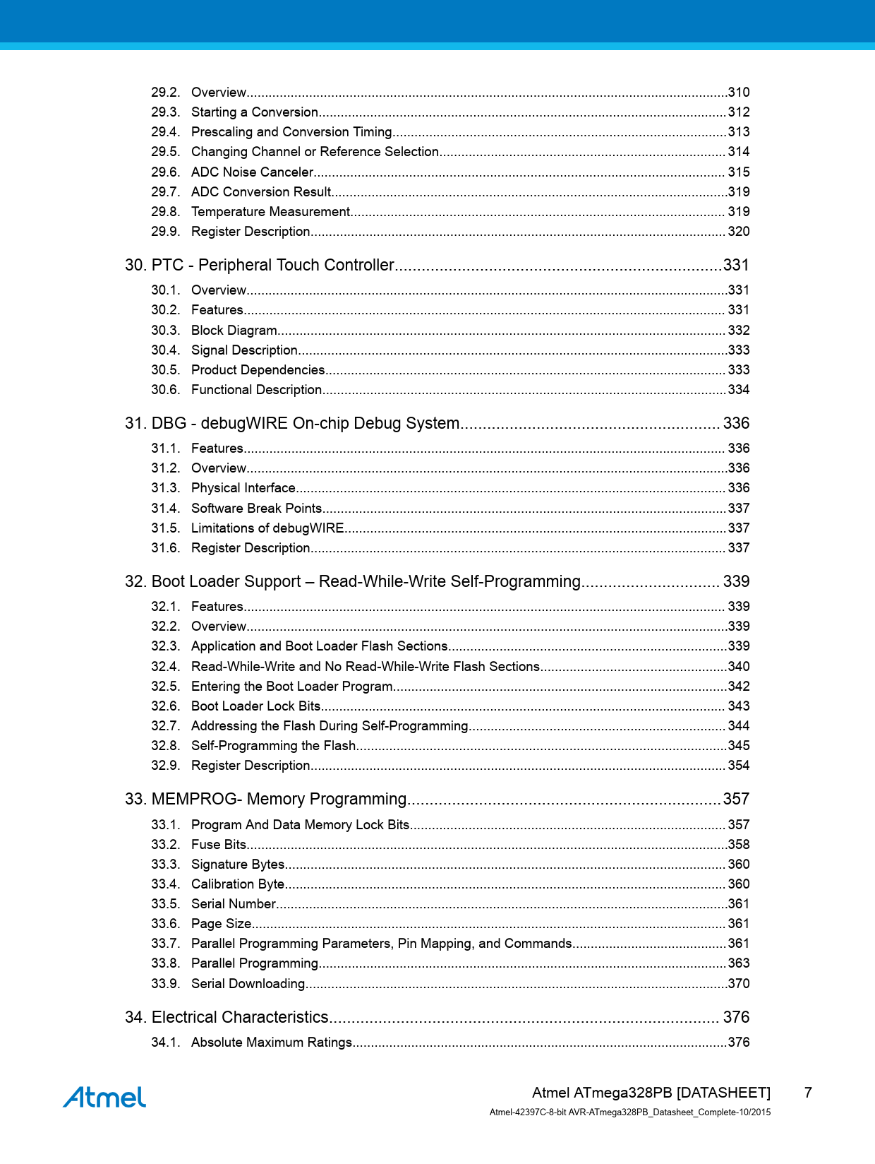 link to page 310 link to page 312 link to page 313 link to page 314 link to page 315 link to page 319 link to page 319 link to page 320 link to page 331 link to page 331 link to page 331 link to page 332 link to page 333 link to page 333 link to page 334 link to page 336 link to page 336 link to page 336 link to page 336 link to page 337 link to page 337 link to page 337 link to page 339 link to page 339 link to page 339 link to page 339 link to page 340 link to page 342 link to page 343 link to page 344 link to page 345 link to page 354 link to page 357 link to page 357 link to page 358 link to page 360 link to page 360 link to page 361 link to page 361 link to page 361 link to page 363 link to page 370 link to page 376 link to page 376 29.2. Overview...310 29.3. Starting a Conversion...312 29.4. Prescaling and Conversion Timing...313 29.5. Changing Channel or Reference Selection.. 314 29.6. ADC Noise Canceler.. 315 29.7. ADC Conversion Result..319 29.8. Temperature Measurement.. 319 29.9. Register Description... 320 30. PTC - Peripheral Touch Controller...331 30.1. Overview...331 30.2. Features... 331 30.3. Block Diagram.. 332 30.4. Signal Description...333 30.5. Product Dependencies... 333 30.6. Functional Description..334 31. DBG - debugWIRE On-chip Debug System.. 336 31.1. Features... 336 31.2. Overview...336 31.3. Physical Interface... 336 31.4. Software Break Points..337 31.5. Limitations of debugWIRE..337 31.6. Register Description... 337 32. Boot Loader Support – Read-While-Write Self-Programming... 339 32.1. Features... 339 32.2. Overview...339 32.3. Application and Boot Loader Flash Sections..339 32.4. Read-While-Write and No Read-While-Write Flash Sections...340 32.5. Entering the Boot Loader Program...342 32.6. Boot Loader Lock Bits.. 343 32.7. Addressing the Flash During Self-Programming.. 344 32.8. Self-Programming the Flash...345 32.9. Register Description... 354 33. MEMPROG- Memory Programming..357 33.1. Program And Data Memory Lock Bits.. 357 33.2. Fuse Bits...358 33.3. Signature Bytes.. 360 33.4. Calibration Byte.. 360 33.5. Serial Number...361 33.6. Page Size... 361 33.7. Parallel Programming Parameters, Pin Mapping, and Commands..361 33.8. Parallel Programming...363 33.9. Serial Downloading...370 34. Electrical Characteristics... 376 34.1. Absolute Maximum Ratings..376 Atmel ATmega328PB [DATASHEET] 7 Atmel-42397C-8-bit AVR-ATmega328PB_Datasheet_Complete-10/2015 Document Outline Introduction Feature Table of Contents 1. Description 2. Configuration Summary 3. Ordering Information 4. Block Diagram 5. Pin Configurations 5.1. Pin Descriptions 5.1.1. VCC 5.1.2. GND 5.1.3. Port B (PB[7:0]) XTAL1/XTAL2/TOSC1/TOSC2 5.1.4. Port C (PC[5:0]) 5.1.5. PC6/RESET 5.1.6. Port D (PD[7:0]) 5.1.7. Port E (PE[3:0]) 5.1.8. AVCC 5.1.9. AREF 5.1.10. ADC[7:6] (TQFP and VFQFN Package Only) 6. I/O Multiplexing 7. Resources 8. Data Retention 9. About Code Examples 10. AVR CPU Core 10.1. Overview 10.2. ALU – Arithmetic Logic Unit 10.3. Status Register 10.3.1. Status Register 10.4. General Purpose Register File 10.4.1. The X-register, Y-register, and Z-register 10.5. Stack Pointer 10.5.1. SPH and SPL - Stack Pointer High and Stack Pointer Low Register 10.6. Instruction Execution Timing 10.7. Reset and Interrupt Handling 10.7.1. Interrupt Response Time 11. AVR Memories 11.1. Overview 11.2. In-System Reprogrammable Flash Program Memory 11.3. SRAM Data Memory 11.3.1. Data Memory Access Times 11.4. EEPROM Data Memory 11.4.1. EEPROM Read/Write Access 11.4.2. Preventing EEPROM Corruption 11.5. I/O Memory 11.5.1. General Purpose I/O Registers 11.6. Register Description 11.6.1. EEPROM Address Register High 11.6.2. EEPROM Address Register Low 11.6.3. EEPROM Data Register 11.6.4. EEPROM Control Register 11.6.5. GPIOR2 – General Purpose I/O Register 2 11.6.6. GPIOR1 – General Purpose I/O Register 1 11.6.7. GPIOR0 – General Purpose I/O Register 0 12. System Clock and Clock Options 12.1. Clock Systems and Their Distribution 12.1.1. CPU Clock – clkCPU 12.1.2. I/O Clock – clkI/O 12.1.3. PTC Clock - clkPTC 12.1.4. Flash Clock – clkFLASH 12.1.5. Asynchronous Timer Clock – clkASY 12.1.6. ADC Clock – clkADC 12.2. Clock Sources 12.2.1. Default Clock Source 12.2.2. Clock Startup Sequence 12.3. Low Power Crystal Oscillator 12.4. Low Frequency Crystal Oscillator 12.5. Calibrated Internal RC Oscillator 12.6. 128kHz Internal Oscillator 12.7. External Clock 12.8. Clock Output Buffer 12.9. Timer/Counter Oscillator 12.10. System Clock Prescaler 12.11. Register Description 12.11.1. Oscillator Calibration Register 12.11.2. Clock Prescaler Register 13. CFD - Clock Failure Detection mechanism 13.1. Overview 13.2. Features 13.3. Operations 13.4. Timing Diagram 13.5. Register Description 13.5.1. XOSC Failure Detection Control And Status Register 14. PM - Power Management and Sleep Modes 14.1. Sleep Modes 14.2. BOD Disable 14.3. Idle Mode 14.4. ADC Noise Reduction Mode 14.5. Power-Down Mode 14.6. Power-save Mode 14.7. Standby Mode 14.8. Extended Standby Mode 14.9. Power Reduction Register 14.10. Minimizing Power Consumption 14.10.1. Analog to Digital Converter 14.10.2. Analog Comparator 14.10.3. Brown-Out Detector 14.10.4. Internal Voltage Reference 14.10.5. Watchdog Timer 14.10.6. Port Pins 14.10.7. On-chip Debug System 14.11. Register Description 14.11.1. Sleep Mode Control Register 14.11.2. MCU Control Register 14.11.3. Power Reduction Register 0 15. SCRST - System Control and Reset 15.1. Resetting the AVR 15.2. Reset Sources 15.3. Power-on Reset 15.4. External Reset 15.5. Brown-out Detection 15.6. Watchdog System Reset 15.7. Internal Voltage Reference 15.7.1. Voltage Reference Enable Signals and Start-up Time 15.8. Watchdog Timer 15.8.1. Features 15.8.2. Overview 15.9. Register Description 15.9.1. MCU Status Register 15.9.2. WDTCSR – Watchdog Timer Control Register 16. INT- Interrupts 16.1. Interrupt Vectors in ATmega328PB 16.2. Register Description 16.2.1. Moving Interrupts Between Application and Boot S