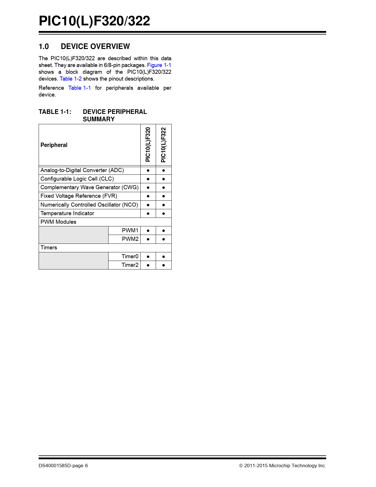 PIC10(L)F320/322. 1.0. DEVICE OVERVIEW. TABLE 1-1:. DEVICE PERIPHERAL SUMMARY. )F32. Peripheral. (L)F3. PIC10(L. PIC10