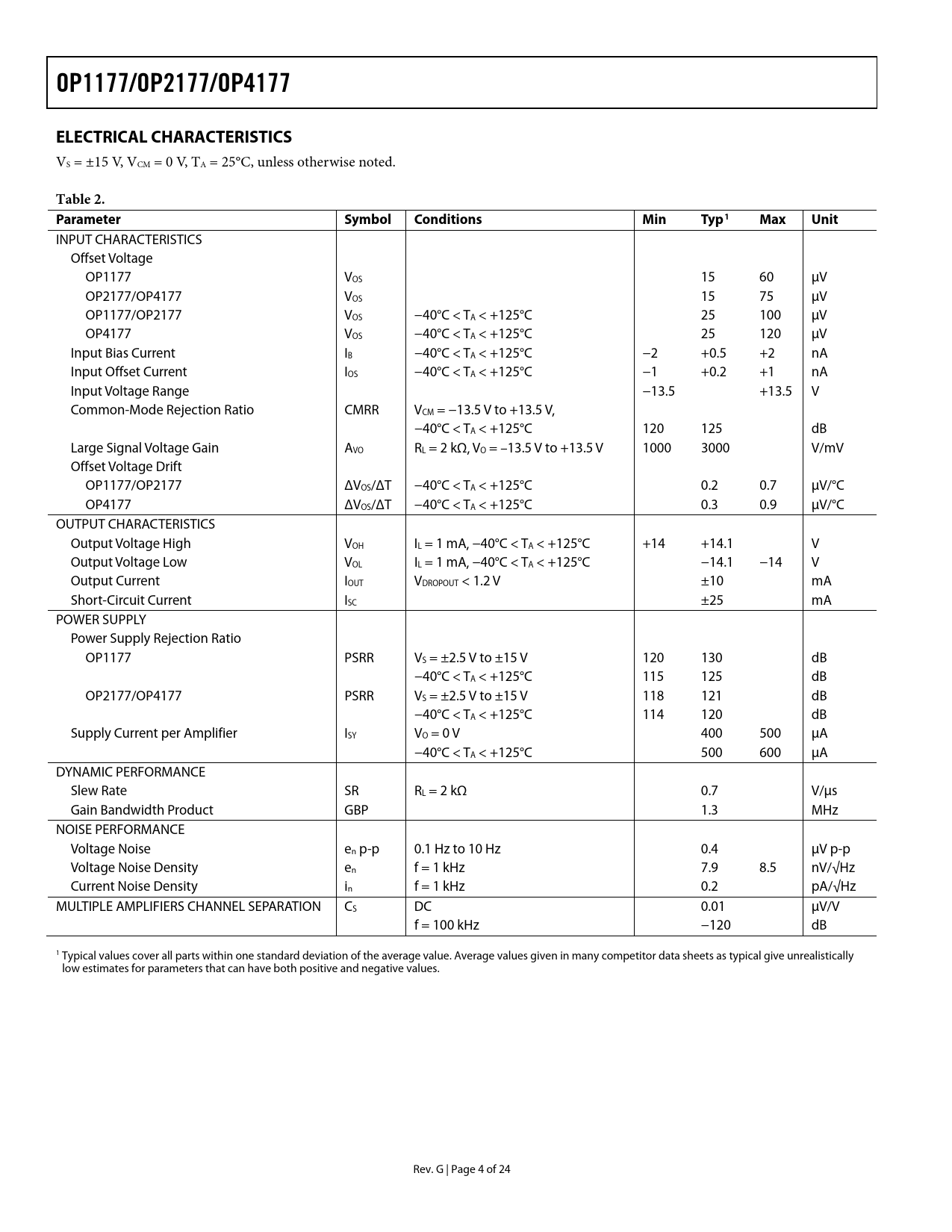 link to page 4 OP1177/OP2177/OP4177ELECTRICAL CHARACTERISTICS VS = ±15 V, VCM = 0 V, TA = 25°C, unless otherwise noted. Table 2. ParameterSymbolConditionsMinTyp1MaxUnit INPUT CHARACTERISTICS Offset Voltage OP1177 VOS 15 60 μV OP2177/OP4177 VOS 15 75 μV OP1177/OP2177 VOS −40°C < TA < +125°C 25 100 μV OP4177 VOS −40°C < TA < +125°C 25 120 μV Input Bias Current IB −40°C < TA < +125°C −2 +0.5 +2 nA Input Offset Current IOS −40°C < TA < +125°C −1 +0.2 +1 nA Input Voltage Range −13.5 +13.5 V Common-Mode Rejection Ratio CMRR VCM = −13.5 V to +13.5 V, −40°C < TA < +125°C 120 125 dB Large Signal Voltage Gain AVO RL = 2 kΩ, VO = –13.5 V to +13.5 V 1000 3000 V/mV Offset Voltage Drift OP1177/OP2177 ΔVOS/ΔT −40°C < TA < +125°C 0.2 0.7 μV/°C OP4177 ΔVOS/ΔT −40°C < TA < +125°C 0.3 0.9 μV/°C OUTPUT CHARACTERISTICS Output Voltage High VOH IL = 1 mA, −40°C < TA < +125°C +14 +14.1 V Output Voltage Low VOL IL = 1 mA, −40°C < TA < +125°C −14.1 −14 V Output Current IOUT VDROPOUT < 1.2 V ±10 mA Short-Circuit Current ISC ±25 mA POWER SUPPLY Power Supply Rejection Ratio OP1177 PSRR VS = ±2.5 V to ±15 V 120 130 dB −40°C < TA < +125°C 115 125 dB OP2177/OP4177 PSRR VS = ±2.5 V to ±15 V 118 121 dB −40°C < TA < +125°C 114 120 dB Supply Current per Amplifier ISY VO = 0 V 400 500 μA −40°C < TA < +125°C 500 600 μA DYNAMIC PERFORMANCE Slew Rate SR RL = 2 kΩ 0.7 V/μs Gain Bandwidth Product GBP 1.3 MHz NOISE PERFORMANCE Voltage Noise en p-p 0.1 Hz to 10 Hz 0.4 μV p-p Voltage Noise Density en f = 1 kHz 7.9 8.5 nV/√Hz Current Noise Density in f = 1 kHz 0.2 pA/√Hz MULTIPLE AMPLIFIERS CHANNEL SEPARATION CS DC 0.01 μV/V f = 100 kHz −120 dB 1 Typical values cover all parts within one standard deviation of the average value. Average values given in many competitor data sheets as typical give unrealistically low estimates for parameters that can have both positive and negative values. Rev. G | Page 4 of 24 Document Outline FEATURES APPLICATIONS PIN CONFIGURATIONS GENERAL DESCRIPTION TABLE OF CONTENTS REVISION HISTORY SPECIFICATIONS ELECTRICAL CHARACTERISTICS ELECTRICAL CHARACTERISTICS ABSOLUTE MAXIMUM RATINGS THERMAL RESISTANCE ESD CAUTION TYPICAL PERFORMANCE CHARACTERISTICS FUNCTIONAL DESCRIPTION TOTAL NOISE-INCLUDING SOURCE RESISTORS GAIN LINEARITY INPUT OVERVOLTAGE PROTECTION OUTPUT PHASE REVERSAL SETTLING TIME OVERLOAD RECOVERY TIME THD + NOISE CAPACITIVE LOAD DRIVE STRAY INPUT CAPACITANCE COMPENSATION REDUCING ELECTROMAGNETIC INTERFERENCE PROPER BOARD LAYOUT DIFFERENCE AMPLIFIERS A HIGH ACCURACY THERMOCOUPLE AMPLIFIER LOW POWER LINEARIZED RTD SINGLE OPERATIONAL AMPLIFIER BRIDGE REALIZATION OF ACTIVE FILTERS BAND-PASS KRC OR SALLEN-KEY FILTER CHANNEL SEPARATION REFERENCES ON NOISE DYNAMICS AND FLICKER NOISE OUTLINE DIMENSIONS ORDERING GUIDE