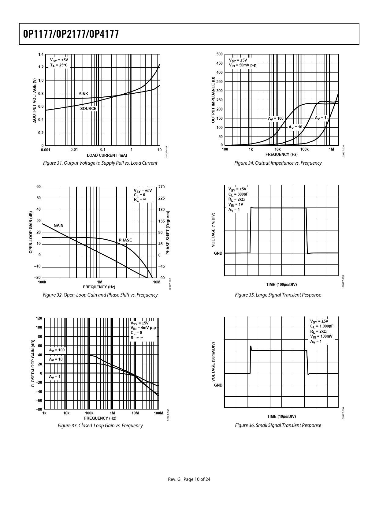Model Line for this Datasheet Text Version of Document OP1177/OP2177/OP4177 1.4 500 VSY = ±5V V 450 SY = ±5V 1.2 TA = 25°C VIN = 50mV p-p 400 ) ) 1.0 Ω (V ( 350 E GE 300 0.8 SINK LTA DANC O E P 250 V T M I U 0.6 P SOURCE 200 T UT P OU UT 150 A Δ 0.4 O V = 100 AV = 1 100 AV = 10 0.2 50 0 0 1 340.001 0.01 0.1 1 10 03100 1k 10k 100k 1M 0 7- 7-LOAD CURRENT (mA) 62FREQUENCY (Hz) 262 02 0 Figure 31. Output Voltage to Supply Rail vs. Load Current Figure 34. Output Impedance vs. Frequency60 270 V V SY = ±5V SY = ±5V C CL = 300pF 50 L = 0 225 RL = ∞ RL = 2kΩ VIN = 1V ) 40 180 ) AV = 1 B ) d ( rees IV IN 30 135 /D eg GAIN D 1V ( GA T E ( 20 90 IF G H A OOP T PHASE S -L 10 E N 45 E VOL HAS OP P 0 0 GND –10 –45 –20 –90 5 2 03100k 1M 10M -03 27- 27TIME (100µs/DIV) FREQUENCY (Hz) 026 26 0 Figure 32. Open-Loop Gain and Phase Shift vs. Frequency Figure 35. Large Signal Transient Response120 V VSY = ±5V SY = ±5V 100 V C IN = 4mV p-p L = 1,000pF C R L = 0 L = 2kΩ 80 V ) RL = ∞ IN = 100mV B A d V = 1 ( 60 IV) D IN AV = 100 V/ 40 GA AV = 10 50m 20 ( OOP E G -L A D 0 T E L S AV = 1 O O V L –20 C GND –40 –60 –80 3 361k 10k 100k 1M 10M 100M -0 -03 27 627FREQUENCY (Hz) TIME (10µs/DIV) 26 02 0 Figure 33. Closed-Loop Gain vs. Frequency Figure 36. Small Signal Transient Response Rev. G | Page 10 of 24 Document Outline FEATURES APPLICATIONS PIN CONFIGURATIONS GENERAL DESCRIPTION TABLE OF CONTENTS REVISION HISTORY SPECIFICATIONS ELECTRICAL CHARACTERISTICS ELECTRICAL CHARACTERISTICS ABSOLUTE MAXIMUM RATINGS THERMAL RESISTANCE ESD CAUTION TYPICAL PERFORMANCE CHARACTERISTICS FUNCTIONAL DESCRIPTION TOTAL NOISE-INCLUDING SOURCE RESISTORS GAIN LINEARITY INPUT OVERVOLTAGE PROTECTION OUTPUT PHASE REVERSAL SETTLING TIME OVERLOAD RECOVERY TIME THD + NOISE CAPACITIVE LOAD DRIVE STRAY INPUT CAPACITANCE COMPENSATION REDUCING ELECTROMAGNETIC INTERFERENCE PROPER BOARD LAYOUT DIFFERENCE AMPLIFIERS A HIGH ACCURACY THERMOCOUPLE AMPLIFIER LOW POWER LINEARIZED RTD SINGLE OPERATIONAL AMPLIFIER BRIDGE REALIZATION OF ACTIVE FILTERS BAND-PASS KRC OR SALLEN-KEY FILTER CHANNEL SEPARATION REFERENCES ON NOISE DYNAMICS AND FLICKER NOISE OUTLINE DIMENSIONS ORDERING GUIDE