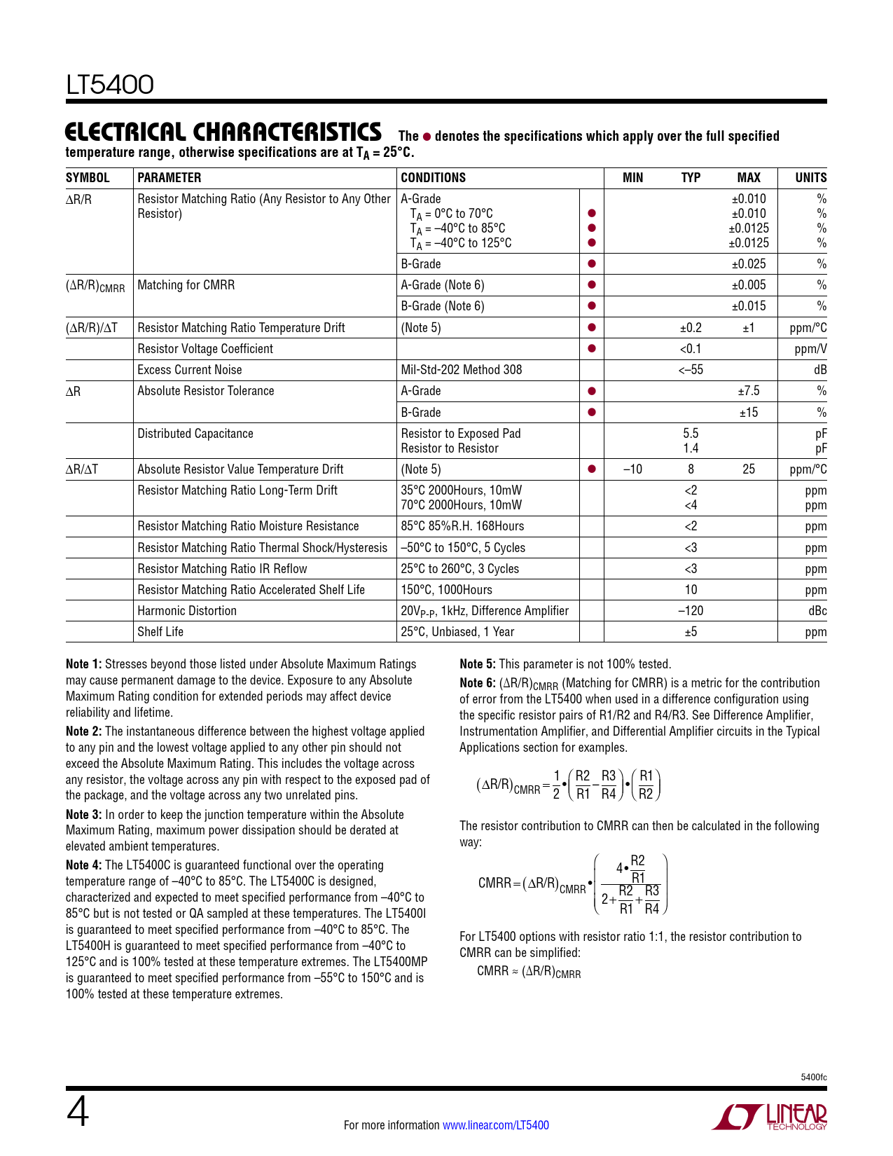 (∆R/R)CMRR (Matching for CMRR) is a metric for the contribution Maximum Rating condition for extended periods may affect device of error from the LT5400 when used in a difference configuration using reliability and lifetime. the specific resistor pairs of R1/R2 and R4/R3. See Difference Amplifier,