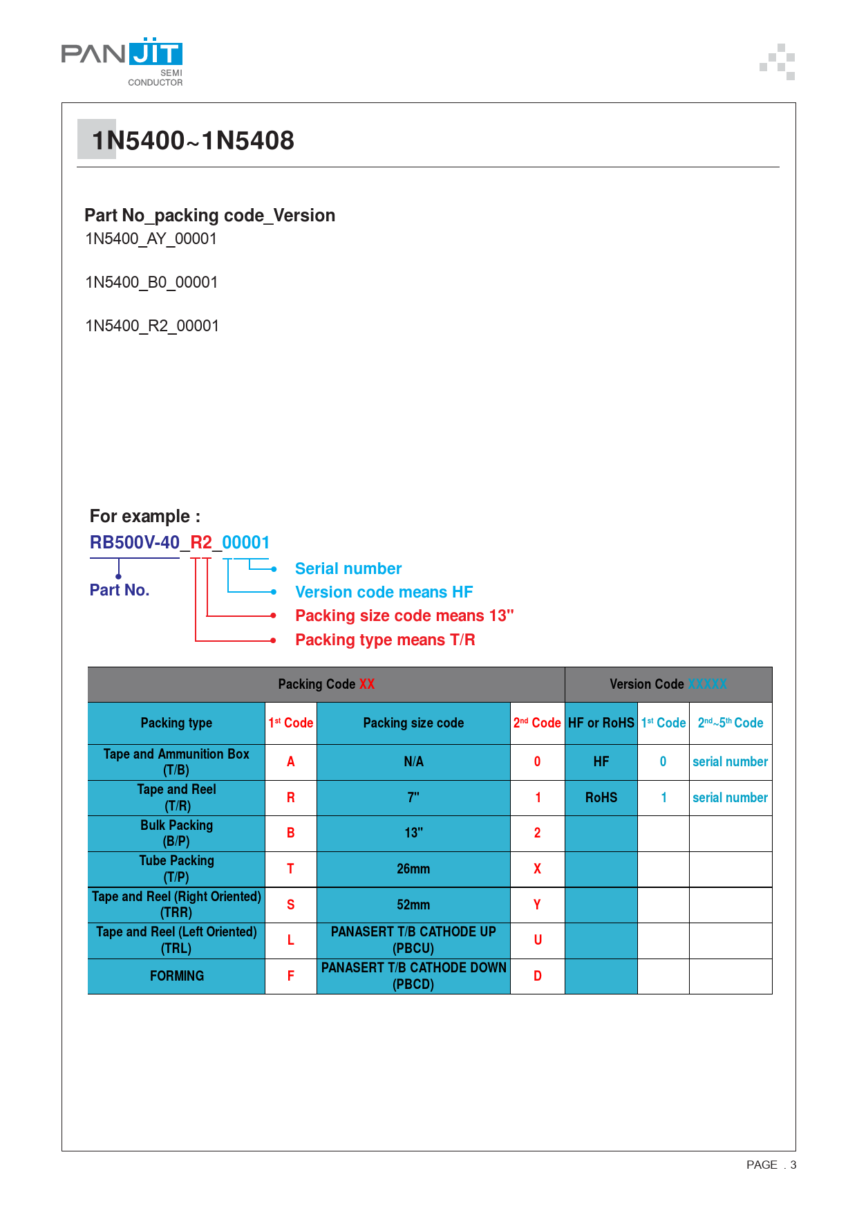 1N5400~1N5408. Part No_packing code_Version. 1N5400_AY_00001. 1N5400_AY_10001. 1N5400_B0_00001. 1N5400_B0_10001. 1N5400_R2_00001