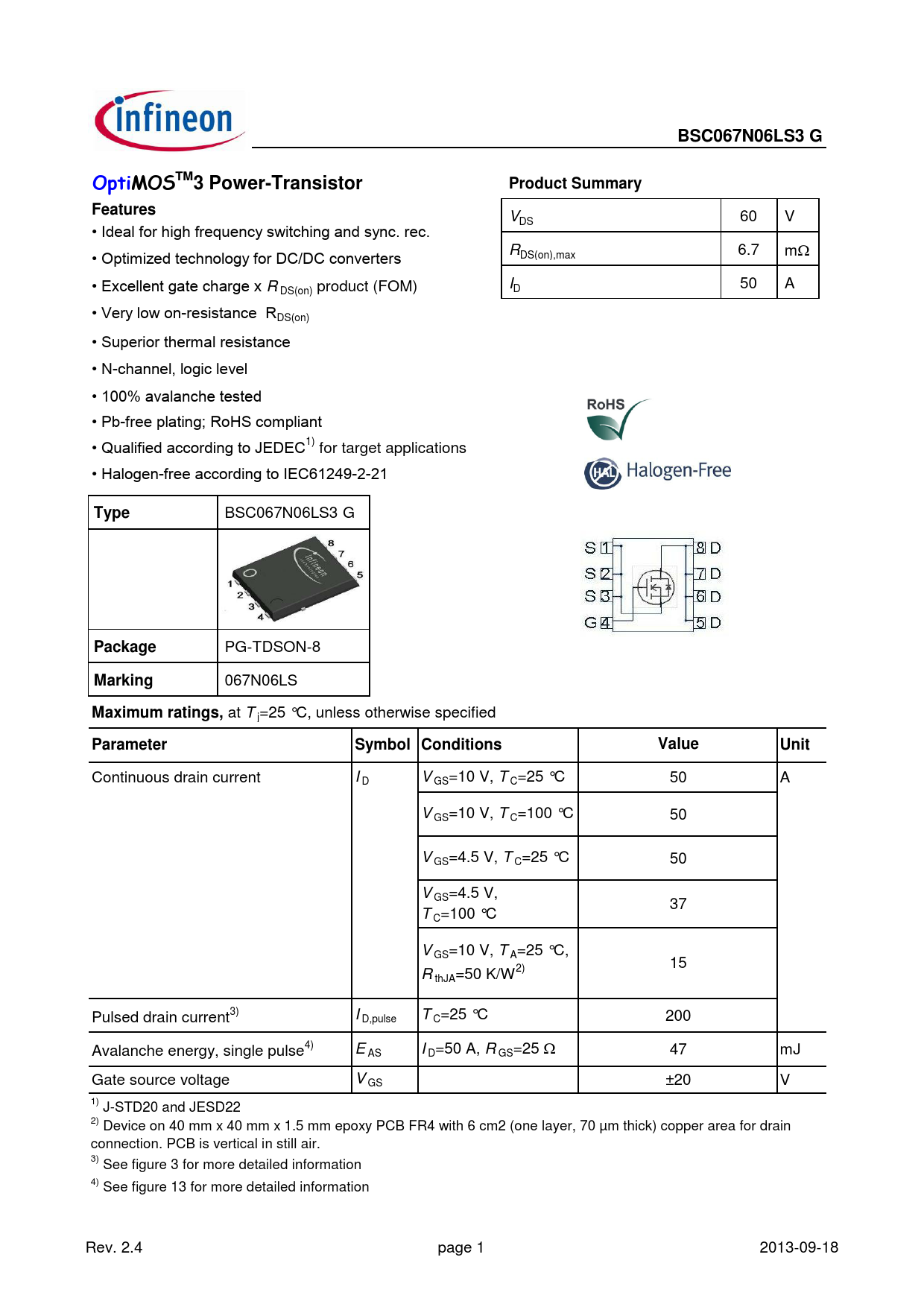 Continuous drain current I D V GS=10 V, T C=25 °C 50 A V GS=10 V, T C=100 °C 50 V GS=4.5 V, T C=25 °C 50 V GS=4.5 V, 37 T C=100 °C V GS=10 V, T A=25 °C, 15 R thJA=50 K/W2) Pulsed drain current3) I D,pulse T C=25 °C 200 Avalanche energy, single pulse4) E AS I D=50 A, R GS=25 W 47 mJ Gate source voltage V GS ±20 V 1) J-STD20 and JESD22 2) Device on 40 mm x 40 mm x 1.5 mm epoxy PCB FR4 with 6 cm2 (one layer, 70 µm thick) copper area for drain connection. PCB is vertical in still air. 3) See figure 3 for more detailed information 4) See figure 13 for more detailed information Rev. 2.4 page 1 2013-09-18