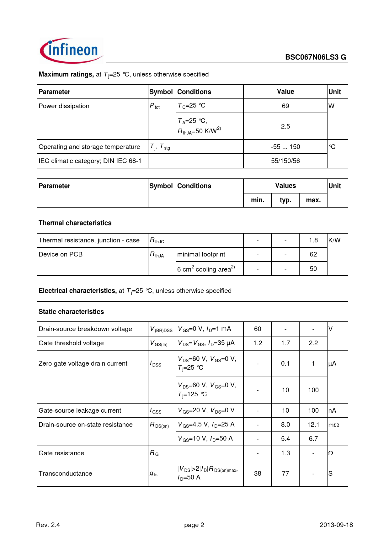 Pages / Page10 / 2 — BSC067N06LS3 G. Maximum ratings,. Parameter. Symbol Conditions. Value. …