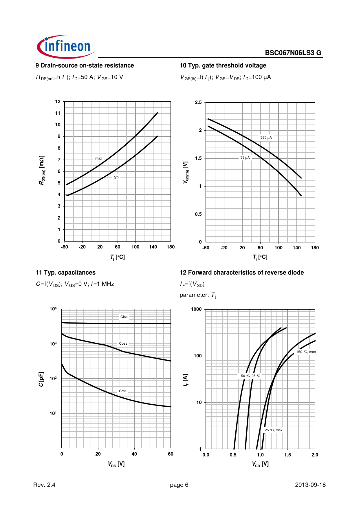 BSC067N06LS3 G9 Drain-source on-state resistance10 Typ. gate threshold voltage R DS(on)=f(T j); I D=50 A; V GS=10 V V GS(th)=f(T j); V GS=V DS; I D=100 µA 122.5111029 350 mA 8] max W 7 35 µA 1.5[m[V]))n6hot(( typ DSGS5RV1430.52100-60-202060100140180-60-202060100140180T[°C]T[°C]jj11 Typ. capacitances12 Forward characteristics of reverse diode C =f(V DS); V GS=0 V; f =1 MHz I F=f(V SD) parameter: T j 1041000 Ciss Coss 103 150 °C, max 100]] 150 °C 25 °C 102[pF[ACIF Crss 10101 25 °C, max 102040600.00.51.01.52.0V[V]V[V]DSSD Rev. 2.4 page 6 2013-09-18