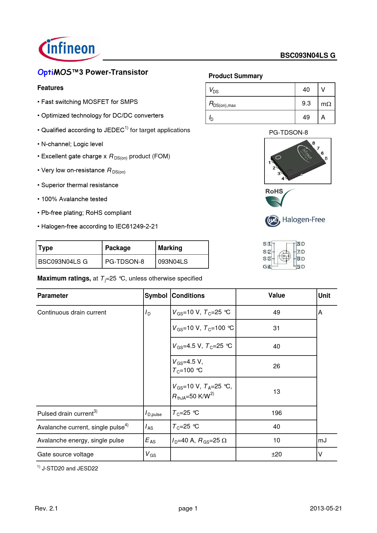 Continuous drain current I D V GS=10 V, T C=25 °C 49 A V GS=10 V, T C=100 °C 31 V GS=4.5 V, T C=25 °C 40 V GS=4.5 V, 26 T C=100 °C V GS=10 V, T A=25 °C, 13 R thJA=50 K/W2) Pulsed drain current3) I D,pulse T C=25 °C 196 Avalanche current, single pulse4) I AS T C=25 °C 40 Avalanche energy, single pulse E AS I D=40 A, R GS=25 W 10 mJ Gate source voltage V GS ±20 V 1) J-STD20 and JESD22 Rev. 2.1 page 1 2013-05-21