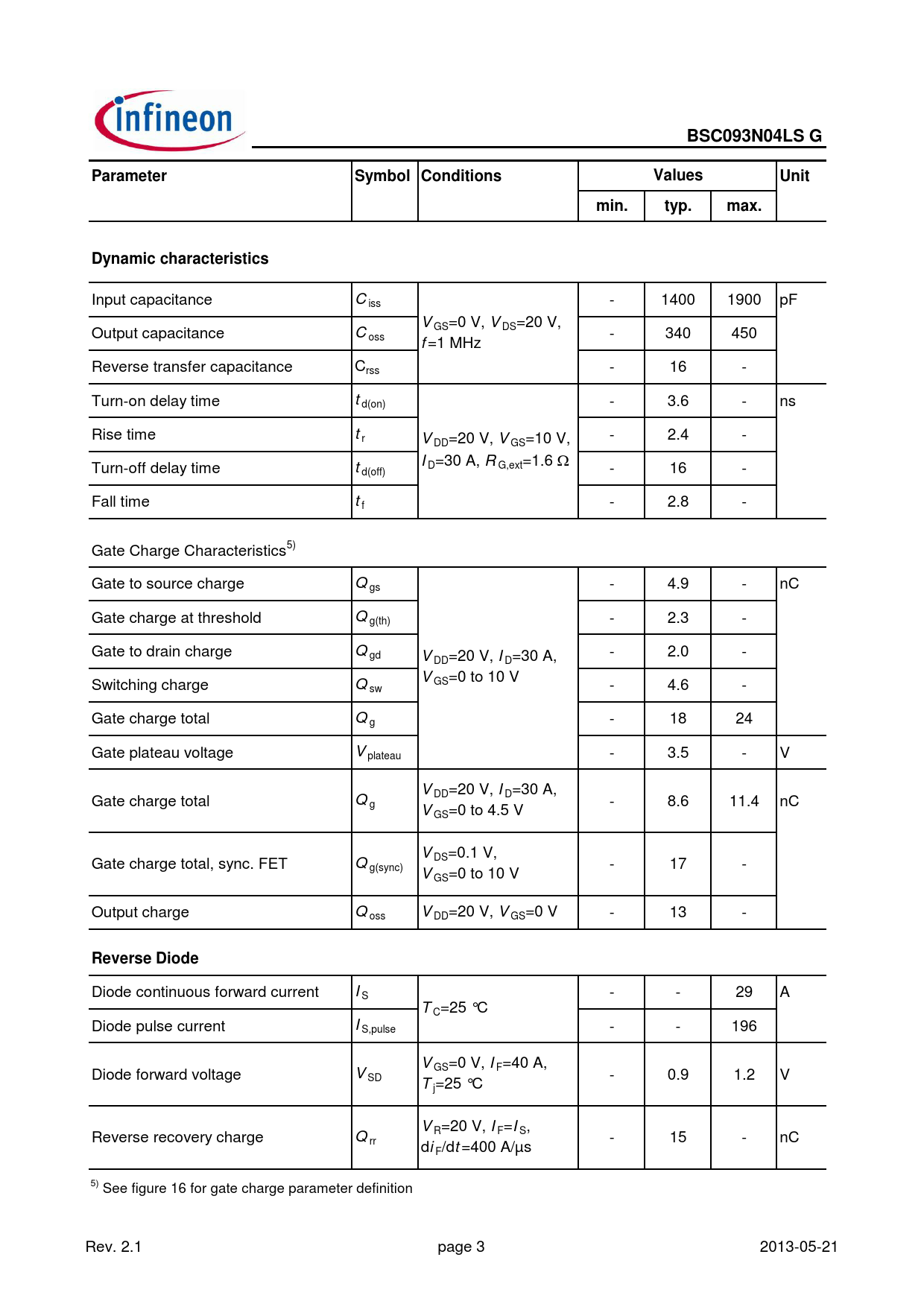 BSC093N04LS G. Parameter. Symbol Conditions. Values. Unit. min. typ. max. Dynamic characteristics. Reverse Diode