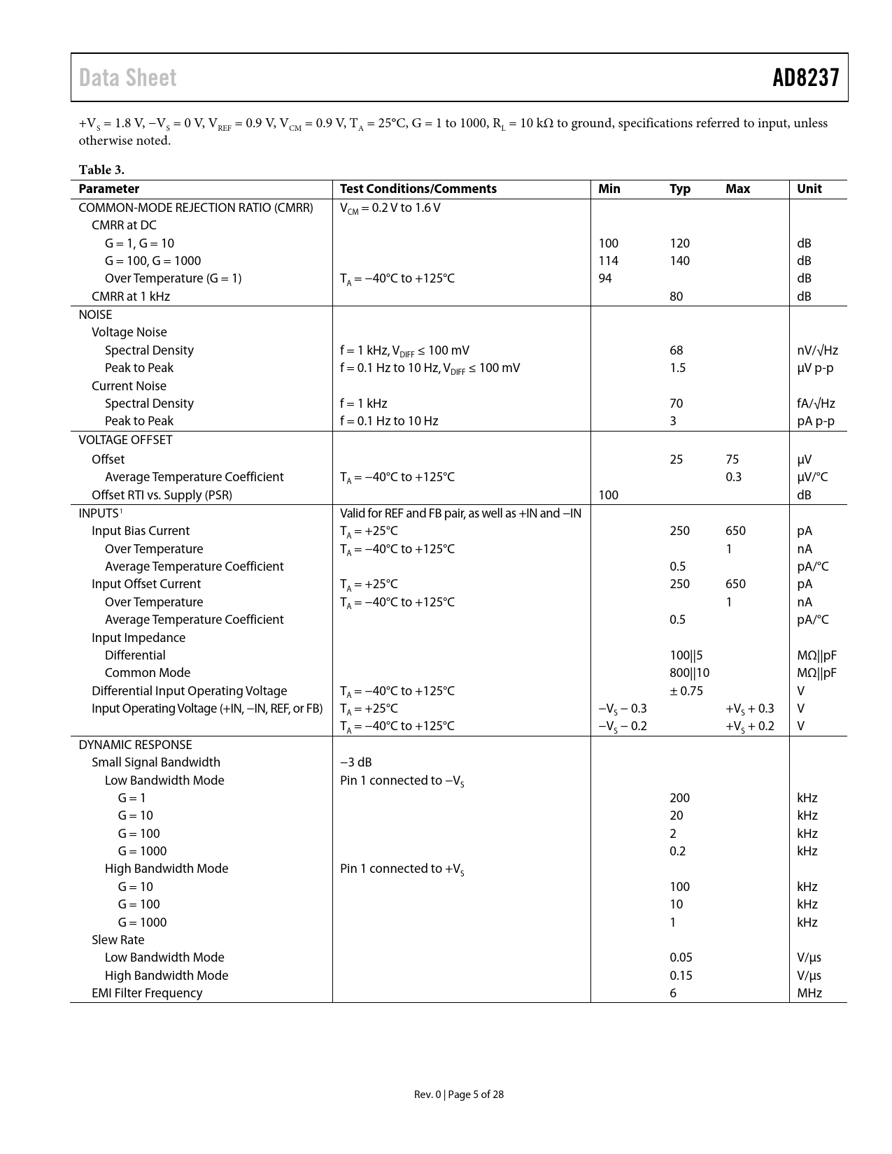 Pages / Page28 / 5 — Data Sheet. AD8237. Table 3. Parameter. Test Conditions/Comments. Min. …