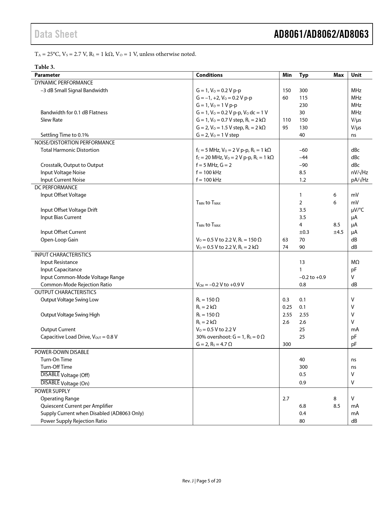 Data SheetAD8061/AD8062/AD8063 TA = 25°C, VS = 2.7 V, RL = 1 kΩ, VO = 1 V, unless otherwise noted. Table 3. ParameterConditionsMinTypMax Unit DYNAMIC PERFORMANCE –3 dB Small Signal Bandwidth G = 1, VO = 0.2 V p-p 150 300 MHz G = –1, +2, VO = 0.2 V p-p 60 115 MHz G = 1, VO = 1 V p-p 230 MHz Bandwidth for 0.1 dB Flatness G = 1, VO = 0.2 V p-p, VO dc = 1 V 30 MHz Slew Rate G = 1, VO = 0.7 V step, RL = 2 kΩ 110 150 V/µs G = 2, VO = 1.5 V step, RL = 2 kΩ 95 130 V/µs Settling Time to 0.1% G = 2, VO = 1 V step 40 ns NOISE/DISTORTION PERFORMANCE Total Harmonic Distortion fC = 5 MHz, VO = 2 V p-p, RL = 1 kΩ –60 dBc fC = 20 MHz, VO = 2 V p-p, RL = 1 kΩ –44 dBc Crosstalk, Output to Output f = 5 MHz, G = 2 –90 dBc Input Voltage Noise f = 100 kHz 8.5 nV/√Hz Input Current Noise f = 100 kHz 1.2 pA/√Hz DC PERFORMANCE Input Offset Voltage 1 6 mV TMIN to TMAX 2 6 mV Input Offset Voltage Drift 3.5 µV/°C Input Bias Current 3.5 µA TMIN to TMAX 4 8.5 µA Input Offset Current ±0.3 ±4.5 µA Open-Loop Gain VO = 0.5 V to 2.2 V, RL = 150 Ω 63 70 dB VO = 0.5 V to 2.2 V, RL = 2 kΩ 74 90 dB INPUT CHARACTERISTICS Input Resistance 13 MΩ Input Capacitance 1 pF Input Common-Mode Voltage Range –0.2 to +0.9 V Common-Mode Rejection Ratio VCM = –0.2 V to +0.9 V 0.8 dB OUTPUT CHARACTERISTICS Output Voltage Swing Low RL = 150 Ω 0.3 0.1 V RL = 2 kΩ 0.25 0.1 V Output Voltage Swing High RL = 150 Ω 2.55 2.55 V RL = 2 kΩ 2.6 2.6 V Output Current VO = 0.5 V to 2.2 V 25 mA Capacitive Load Drive, VOUT = 0.8 V 30% overshoot: G = 1, RS = 0 Ω 25 pF G = 2, RS = 4.7 Ω 300 pF POWER-DOWN DISABLE Turn-On Time 40 ns Turn-Off Time 300 ns DISABLE Voltage (Off) 0.5 V DISABLE Voltage (On) 0.9 V POWER SUPPLY Operating Range 2.7 8 V Quiescent Current per Amplifier 6.8 8.5 mA Supply Current when Disabled (AD8063 Only) 0.4 mA Power Supply Rejection Ratio 80 dB Rev. J | Page 5 of 20 Document Outline Features Applications Connection Diagrams General Description Revision History Specifications Absolute Maximum Ratings Maximum Power Dissipation ESD Caution Typical Performance Characteristics Circuit Description Headroom Considerations Overload Behavior and Recovery Input Output Capacitive Load Drive Disable Operation Board Layout Considerations Applications Information Single-Supply Sync Stripper RGB Amplifier Multiplexer Outline Dimensions Ordering Guide