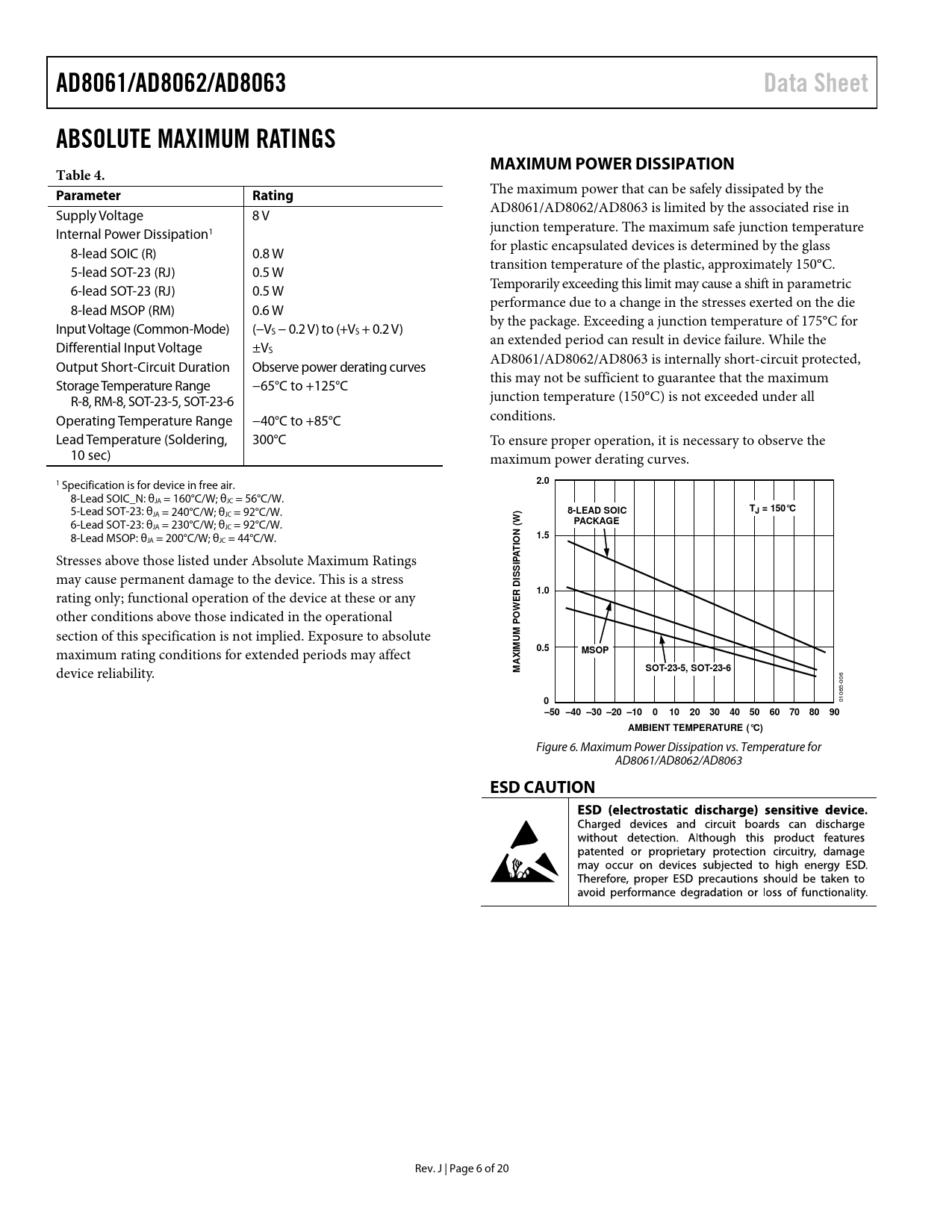 AD8061/AD8062/AD8063. Data Sheet. ABSOLUTE MAXIMUM RATINGS. MAXIMUM POWER DISSIPATION. Table 4. Parameter. Rating. 2.0. 8-LEAD SOIC