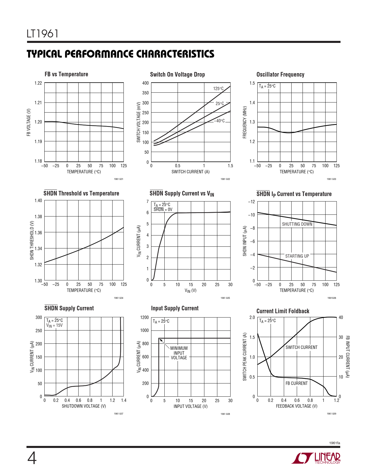 1.22 400 1.5 T 125°C A = 25°C 350 1.21 300 25°C 1.4 250 1.20 200 –40°C 1.3 FB VOLTAGE (V) 150 FREQUENCY (MHz) 1.19 SWITCH VOLTAGE (mV) 100 1.2 50 1.18 0 1.1 –50 –25 0 25 50 75 100 125 0 0.5 1 1.5 –50 –25 0 25 50 75 100 125 TEMPERATURE (°C) SWITCH CURRENT (A) TEMPERATURE (°C) 1961 G01 1961 G02 1961 G03