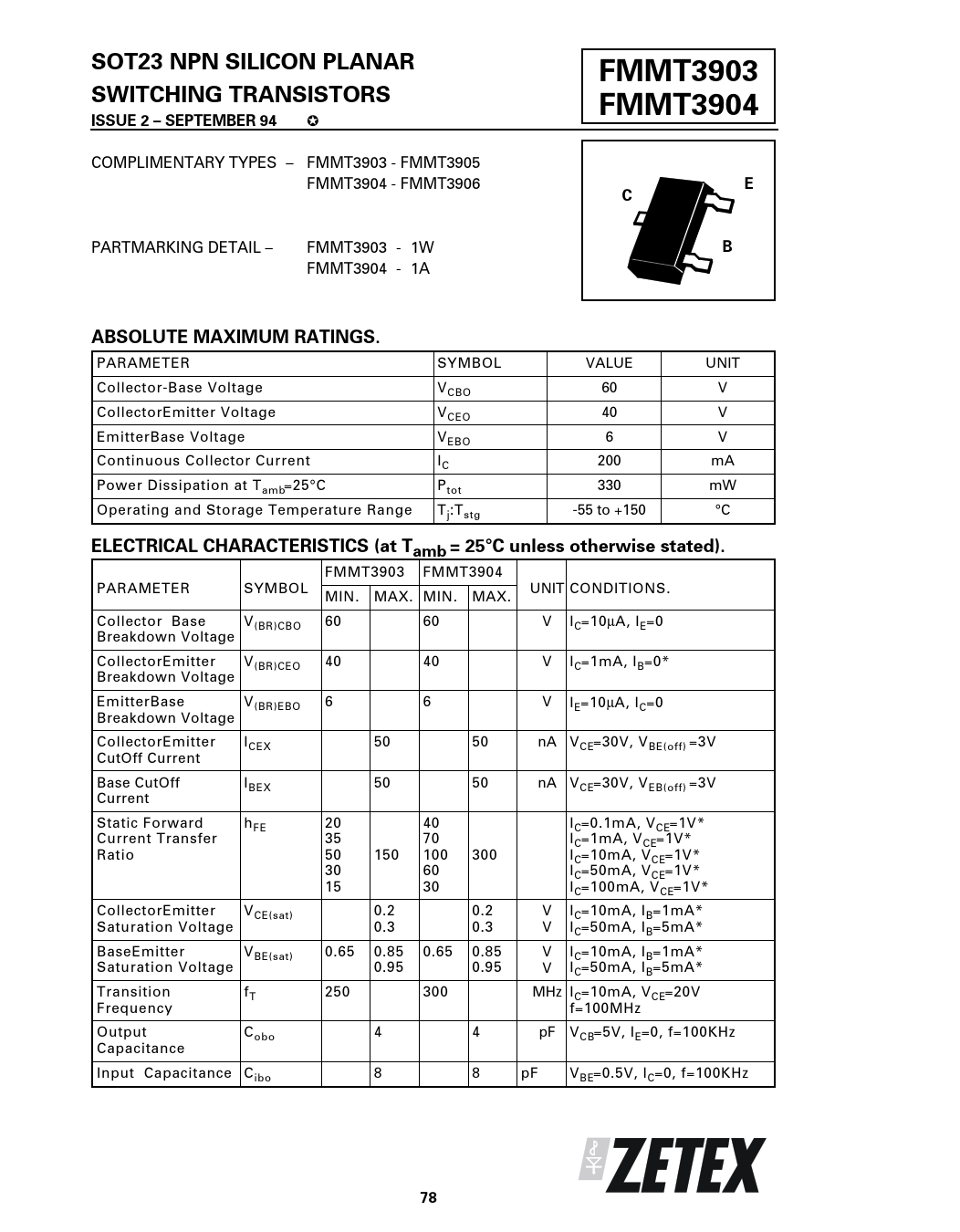 SOT23 NPN SILICON PLANAR. FMMT3903. SWITCHING TRANSISTORS. FMMT3904. ISSUE 2 – SEPTEMBER 94. ABSOLUTE MAXIMUM RATINGS