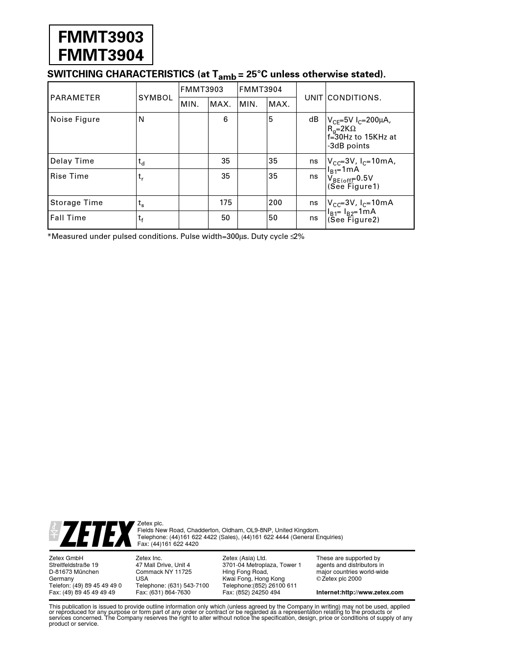 FMMT3903 FMMT3904SWITCHING CHARACTERISTICS (at Tamb = 25°C unless otherwise stated). FMMT3903 FMMT3904 PARAMETER SYMBOL UNIT CONDITIONS. MIN. MAX. MIN. MAX. Noise Figure N 6 5 dB VCE=5V IC=200µA, Rg=2KΩ f=30Hz to 15KHz at -3dB points Delay Time td 35 35 ns VCC=3V, IC=10mA, IB1=1mA Rise Time tr 35 35 ns VBE(off)=0.5V (See Figure1) Storage Time ts 175 200 ns VCC=3V, IC=10mA IB1= IB2=1mA Fall Time tf 50 50 ns (See Figure2) *Measured under pulsed conditions. Pulse width=300µs. Duty cycle ≤ 2% Zetex plc. Fields New Road, Chadderton, Oldham, OL9-8NP, United Kingdom. Telephone: (44)161 622 4422 (Sales), (44)161 622 4444 (General Enquiries) Fax: (44)161 622 4420 Zetex GmbH Zetex Inc. Zetex (Asia) Ltd. These are supported by Streitfeldstraße 19 47 Mall Drive, Unit 4 3701-04 Metroplaza, Tower 1 agents and distributors in D-81673 München Commack NY 11725 Hing Fong Road, major countries world-wide Germany USA Kwai Fong, Hong Kong Zetex plc 2000 Telefon: (49) 89 45 49 49 0 Telephone: (631) 543-7100 Telephone:(852) 26100 611 Fax: (49) 89 45 49 49 49 Fax: (631) 864-7630 Fax: (852) 24250 494 Internet:http://www.zetex.com This publication is issued to provide outline information only which (unless agreed by the Company in writing) may not be used, applied or reproduced for any purpose or form part of any order or contract or be regarded as a representation relating to the products or services concerned. The Company reserves the right to alter without notice the specification, design, price or conditions of supply of any product or service.