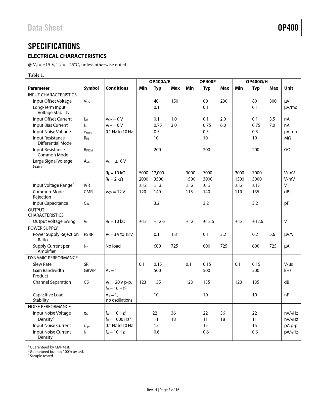 | Pages / Page | 16 / 3 — Data Sheet. OP400. SPECIFICATIONS ELECTRICAL CHARACTERISTICS. Table 1. … |