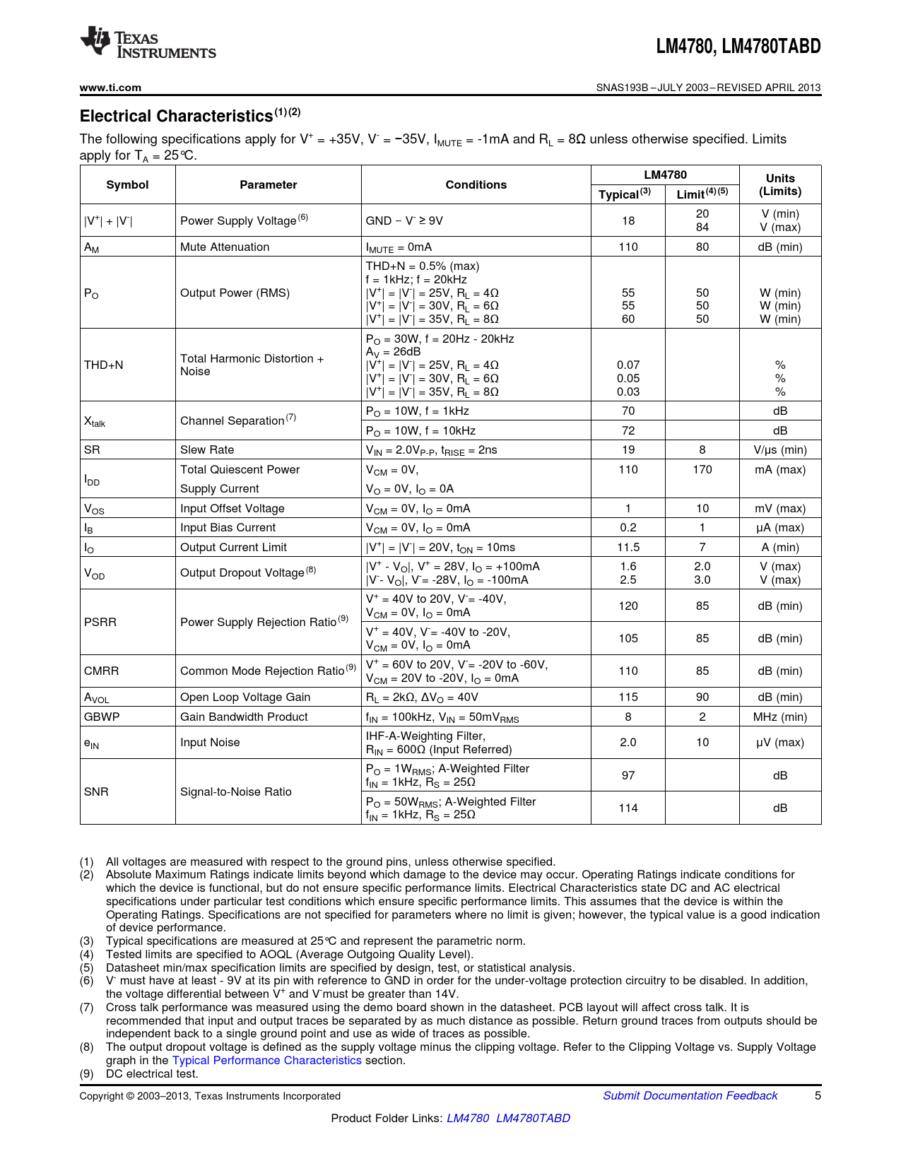 LM4780. , LM4780TABD. www.ti.com. Electrical Characteristics(1)(2). Units. Symbol. Parameter. Conditions. (Limits). Typical(3). Limit(4)(5)