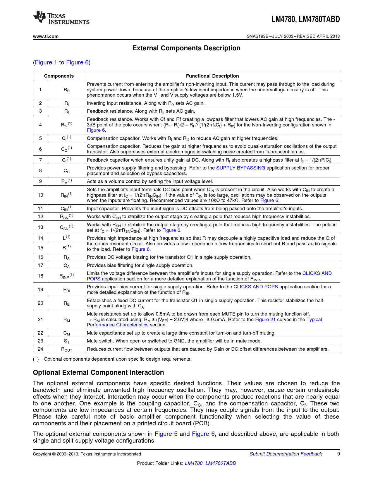| Pages / Page | 31 / 9 — LM4780. , LM4780TABD. www.ti.com. External Components Description. … |