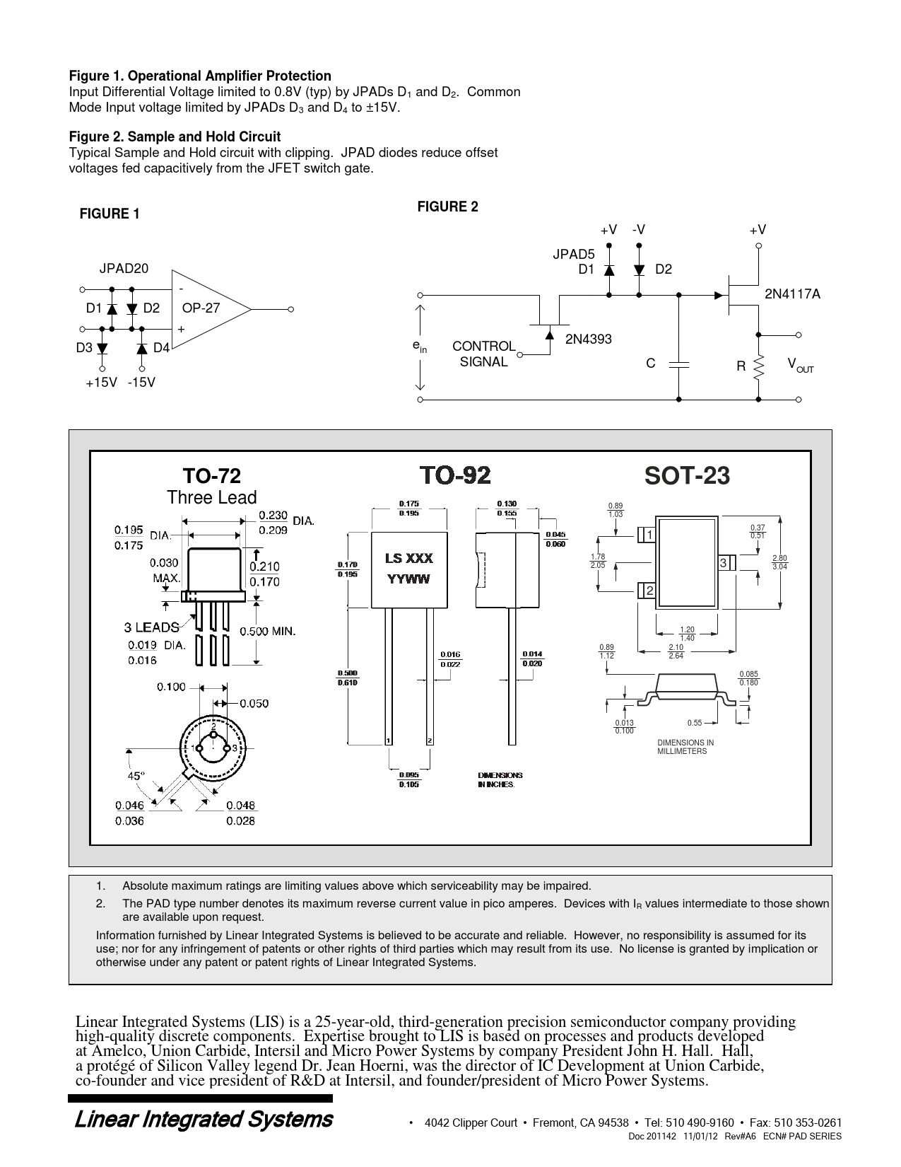 Figure 1. Operational Amplifier Protection Input Differential Voltage limited to 0.8V (typ) by JPADs D1 and D2. Common Mode Input voltage limited by JPADs D3 and D4 to ±15V. Figure 2. Sample and Hold Circuit Typical Sample and Hold circuit with clipping. JPAD diodes reduce offset voltages fed capacitively from the JFET switch gate. FIGURE 2FIGURE 1 +V -V +V JPAD5 JPAD20 D1 D2 - 2N4117A D1 D2 OP-27 + 2N4393 D3 D4 ein CONTROL SIGNAL C R VOUT +15V -15V TO-72SOT-23 Three Lead 0.89 1.03 0.37 1 0.51 1.78 2.80 2.05 3 3.04 2 1.20 1.40 0.89 2.10 1.12 2.64 0.085 0.180 0.013 0.55 0.100 DIMENSIONS IN MILLIMETERS 1. Absolute maximum ratings are limiting values above which serviceability may be impaired. 2. The PAD type number denotes its maximum reverse current value in pico amperes. Devices with IR values intermediate to those shown are available upon request. Information furnished by Linear Integrated Systems is believed to be accurate and reliable. However, no responsibility is assumed for its use; nor for any infringement of patents or other rights of third parties which may result from its use. No license is granted by implication or otherwise under any patent or patent rights of Linear Integrated Systems. Linear Integrated Systems (LIS) is a 25-year-old, third-generation precision semiconductor company providing high-quality discrete components. Expertise brought to LIS is based on processes and products developed at Amelco, Union Carbide, Intersil and Micro Power Systems by company President John H. Hall. Hall, a protégé of Silicon Valley legend Dr. Jean Hoerni, was the director of IC Development at Union Carbide, co-founder and vice president of R&D at Intersil, and founder/president of Micro Power Systems. Linear Integrated Systems • 4042 Clipper Court • Fremont, CA 94538 • Tel: 510 490-9160 • Fax: 510 353-0261 Doc 201142 11/01/12 Rev#A6 ECN# PAD SERIES