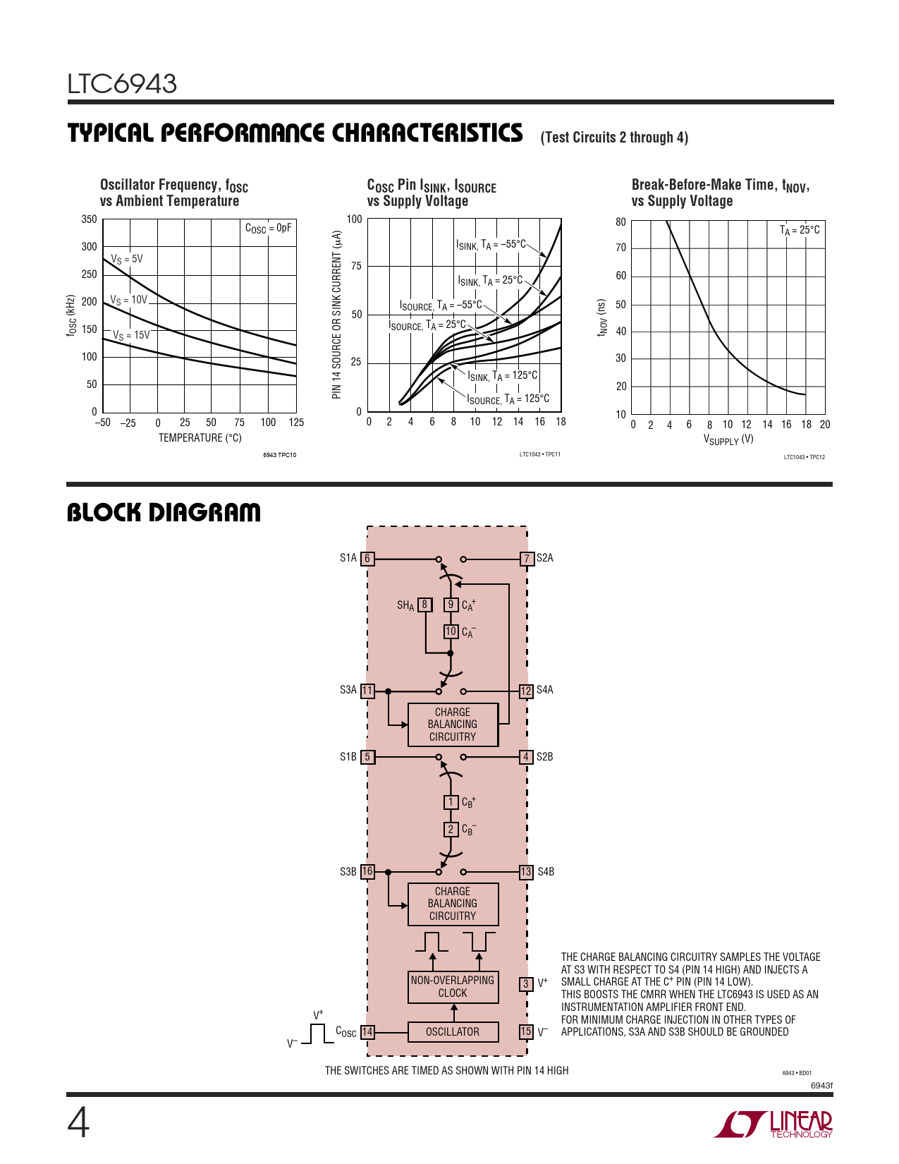 S1A 6 7 S2A 8 9 C + SHA A 10 C – A S3A 11 12 S4A CHARGE BALANCING CIRCUITRY S1B 5 4 S2B 1 C + B 2 C – B S3B 16 13 S4B CHARGE BALANCING CIRCUITRY THE CHARGE BALANCING CIRCUITRY SAMPLES THE VOLTAGE AT S3 WITH RESPECT TO S4 (PIN 14 HIGH) AND INJECTS A NON-OVERLAPPING 3 V+ SMALL CHARGE AT THE C+ PIN (PIN 14 LOW). CLOCK THIS BOOSTS THE CMRR WHEN THE LTC6943 IS USED AS AN INSTRUMENTATION AMPLIFIER FRONT END. V+ FOR MINIMUM CHARGE INJECTION IN OTHER TYPES OF COSC 14 OSCILLATOR 15 V– APPLICATIONS, S3A AND S3B SHOULD BE GROUNDED V– THE SWITCHES ARE TIMED AS SHOWN WITH PIN 14 HIGH 6943 • BD01 6943f 4