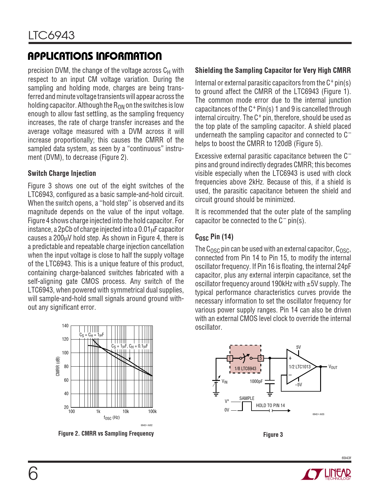 visible especially when the LTC6943 is used with clock frequencies above 2kHz. Because of this, if a shield is Figure 3 shows one out of the eight switches of the used, the parasitic capacitance between the shield and LTC6943, configured as a basic sample-and-hold circuit. circuit ground should be minimized. When the switch opens, a ‘‘hold step’’ is observed and its magnitude depends on the value of the input voltage. It is recommended that the outer plate of the sampling Figure 4 shows charge injected into the hold capacitor. For capacitor be connected to the C– pin(s). instance, a 2pCb of charge injected into a 0.01µF capacitor causes a 200µV hold step. As shown in Figure 4, there is