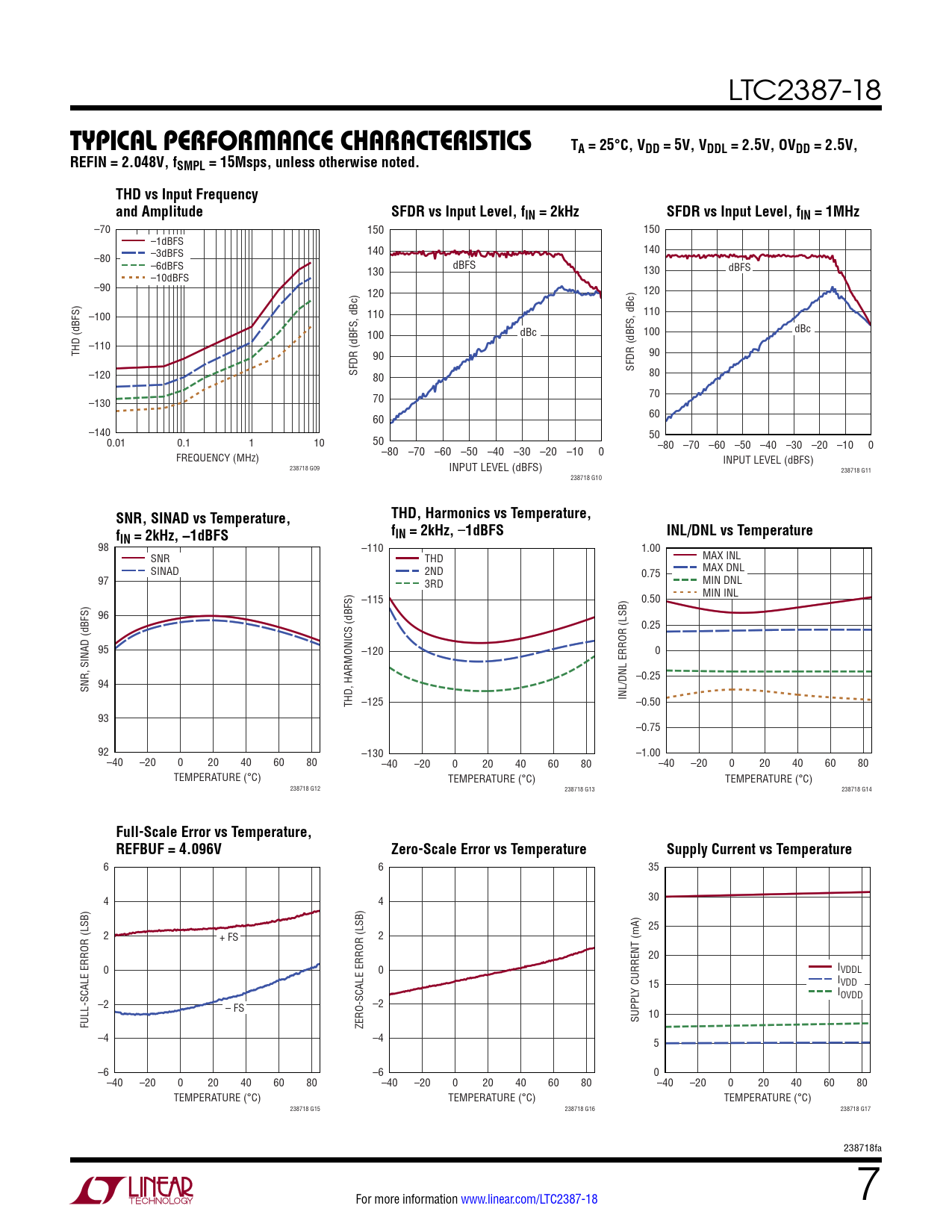 98 –110 1.00 SNR THD MAX INL SINAD 2ND MAX DNL 0.75 97 3RD MIN DNL MIN INL –115 0.50 96 0.25 95 –120 0 –0.25 94 SNR, SINAD (dBFS) INL/DNL ERROR (LSB) THD, HARMONICS (dBFS) –125 –0.50 93 –0.75 92 –130 –1.00 –40 –20 0 20 40 60 80 –40 –20 0 20 40 60 80 –40 –20 0 20 40 60 80 TEMPERATURE (°C) TEMPERATURE (°C) TEMPERATURE (°C) 238718 G12 238718 G13 238718 G14