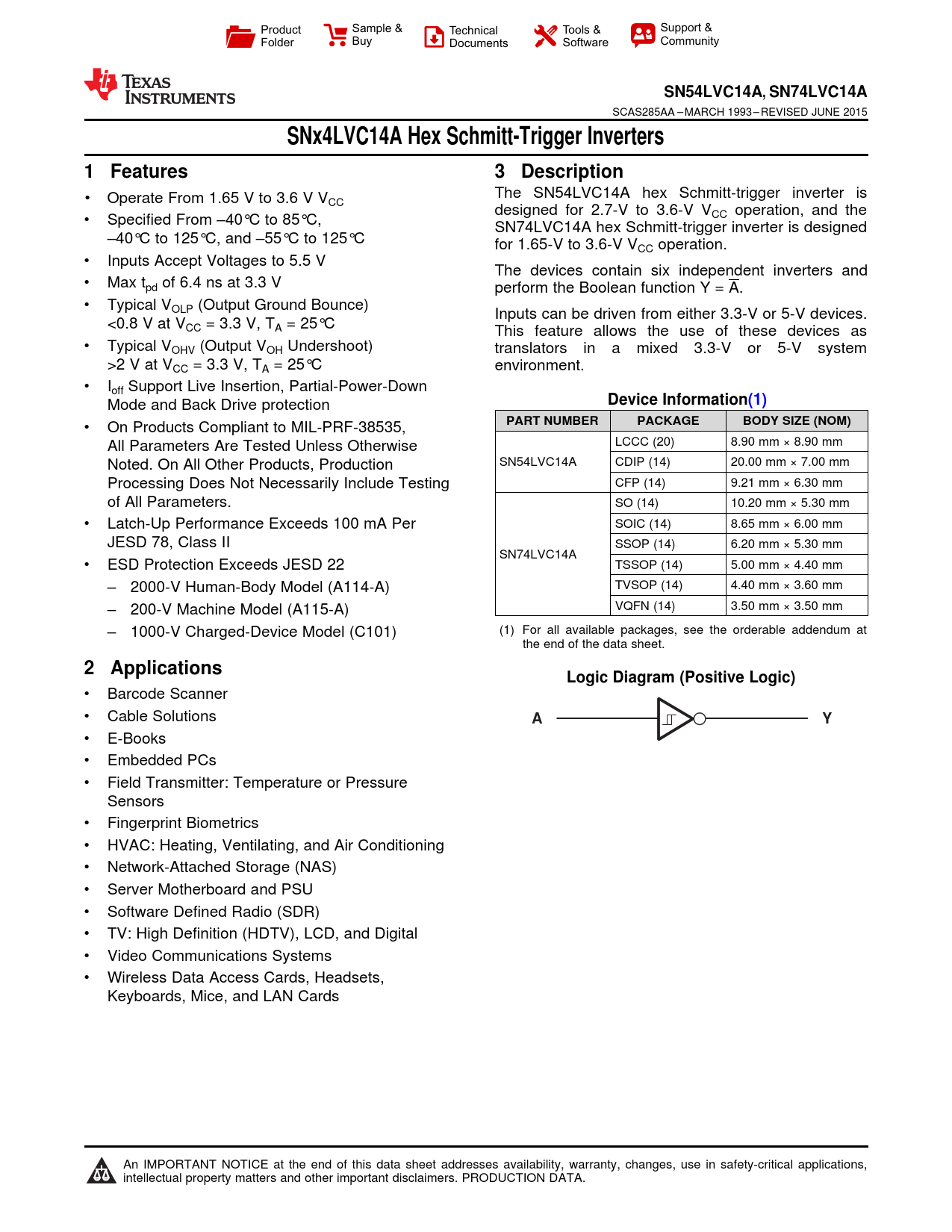 link to page 15 link to page 15 link to page 15 link to page 15 link to page 15 link to page 1 Product Sample & Technical Tools & Support & Folder Buy Documents Software Community SN54LVC14A, SN74LVC14A SCAS285AA – MARCH 1993 – REVISED JUNE 2015 SNx4LVC14A Hex Schmitt-Trigger Inverters1 Features3 Description The SN54LVC14A hex Schmitt-trigger inverter is • Operate From 1.65 V to 3.6 V V 1 CC designed for 2.7-V to 3.6-V VCC operation, and the • Specified From –40°C to 85°C, SN74LVC14A hex Schmitt-trigger inverter is designed –40°C to 125°C, and –55°C to 125°C for 1.65-V to 3.6-V VCC operation. • Inputs Accept Voltages to 5.5 V The devices contain six independent inverters and • Max tpd of 6.4 ns at 3.3 V perform the Boolean function Y = A. • Typical VOLP (Output Ground Bounce) Inputs can be driven from either 3.3-V or 5-V devices. <0.8 V at VCC = 3.3 V, TA = 25°C This feature allows the use of these devices as • Typical VOHV (Output VOH Undershoot) translators in a mixed 3.3-V or 5-V system >2 V at VCC = 3.3 V, TA = 25°C environment. • Ioff Support Live Insertion, Partial-Power-Down Device Information(1) Mode and Back Drive protection PART NUMBERPACKAGEBODY SIZE (NOM) • On Products Compliant to MIL-PRF-38535, LCCC (20) 8.90 mm × 8.90 mm All Parameters Are Tested Unless Otherwise SN54LVC14A CDIP (14) 20.00 mm × 7.00 mm Noted. On All Other Products, Production Processing Does Not Necessarily Include Testing CFP (14) 9.21 mm × 6.30 mm of All Parameters. SO (14) 10.20 mm × 5.30 mm • Latch-Up Performance Exceeds 100 mA Per SOIC (14) 8.65 mm × 6.00 mm JESD 78, Class II SSOP (14) 6.20 mm × 5.30 mm SN74LVC14A • ESD Protection Exceeds JESD 22 TSSOP (14) 5.00 mm × 4.40 mm TVSOP (14) 4.40 mm × 3.60 mm – 2000-V Human-Body Model (A114-A) VQFN (14) 3.50 mm × 3.50 mm – 200-V Machine Model (A115-A) (1) For all available packages, see the orderable addendum at – 1000-V Charged-Device Model (C101) the end of the data sheet. 2 ApplicationsLogic Diagram (Positive Logic) • Barcode Scanner • Cable Solutions AY • E-Books • Embedded PCs • Field Transmitter: Temperature or Pressure Sensors • Fingerprint Biometrics • HVAC: Heating, Ventilating, and Air Conditioning • Network-Attached Storage (NAS) • Server Motherboard and PSU • Software Defined Radio (SDR) • TV: High Definition (HDTV), LCD, and Digital • Video Communications Systems • Wireless Data Access Cards, Headsets, Keyboards, Mice, and LAN Cards 1 An IMPORTANT NOTICE at the end of this data sheet addresses availability, warranty, changes, use in safety-critical applications, intellectual property matters and other important disclaimers. PRODUCTION DATA. Document Outline 1 Features 2 Applications 3 Description Table of Contents 4 Revision History 5 Device Options 6 Pin Configuration and Functions 7 Specifications 7.1 Absolute Maximum Ratings 7.2 ESD Ratings 7.3 Recommended Operating Conditions, SN54LVC14A 7.4 Recommended Operating Conditions, SN74LVC14A 7.5 Thermal Information 7.6 Electrical Characteristics, SN54LVC14A 7.7 Electrical Characteristics, SN74LVC14A 7.8 Switching Characteristics, SN54LVC14A 7.9 Switching Characteristics, SN74LVC14A 7.10 Operating Characteristics 7.11 Typical Characteristics 8 Parameter Measurement Information 9 Detailed Description 9.1 Overview 9.2 Functional Block Diagram 9.3 Feature Description 9.4 Device Functional Modes 10 Application and Implementation 10.1 Application Information 10.2 Typical Application 10.2.1 Design Requirements 10.2.2 Detailed Design Procedure 10.2.3 Application Curves 11 Power Supply Recommendations 12 Layout 12.1 Layout Guidelines 12.2 Layout Examples 13 Device and Documentation Support 13.1 Related Links 13.2 Community Resources 13.3 Trademarks 13.4 Electrostatic Discharge Caution 13.5 Glossary 14 Mechanical, Packaging, and Orderable Information
