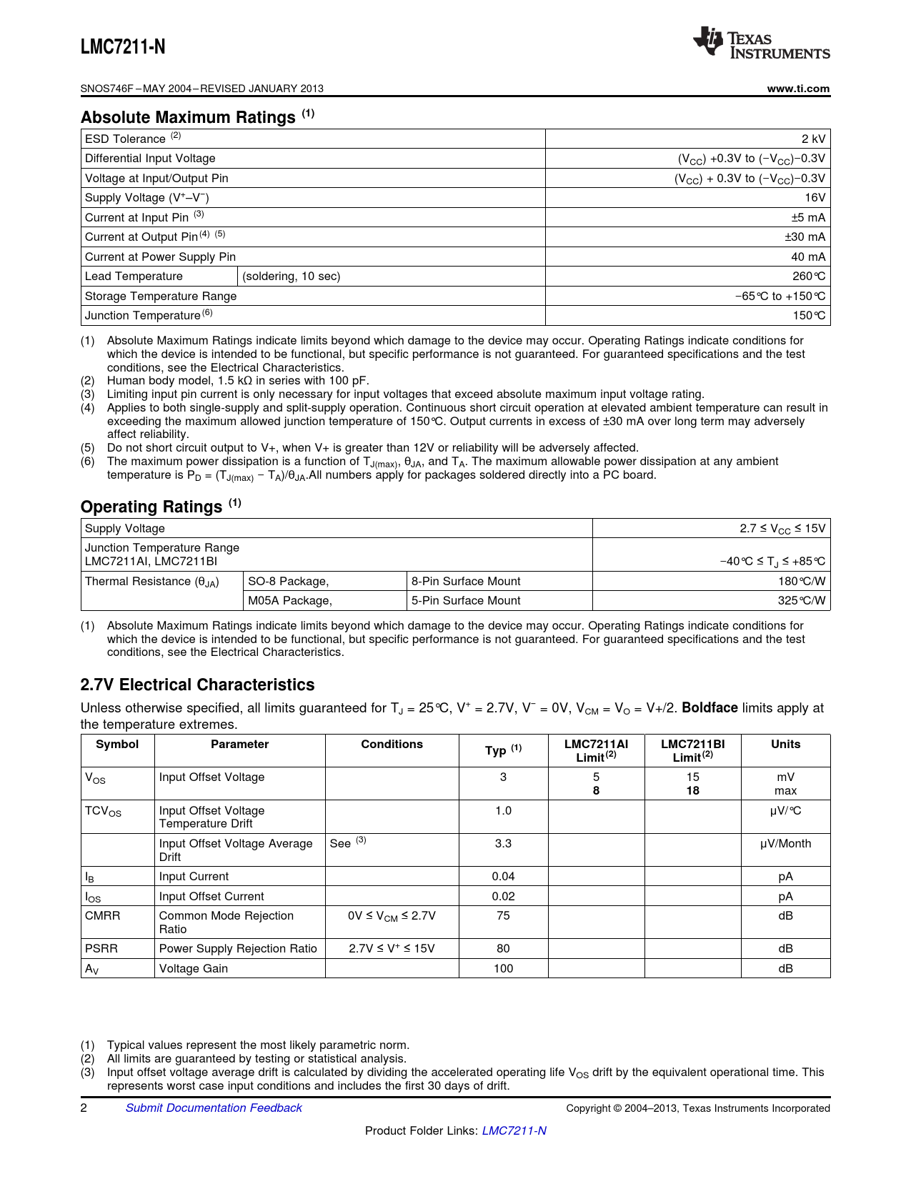LMC7211-N. www.ti.com. Absolute Maximum Ratings (1). Operating Ratings (1). 2.7V Electrical Characteristics. Boldface. Symbol