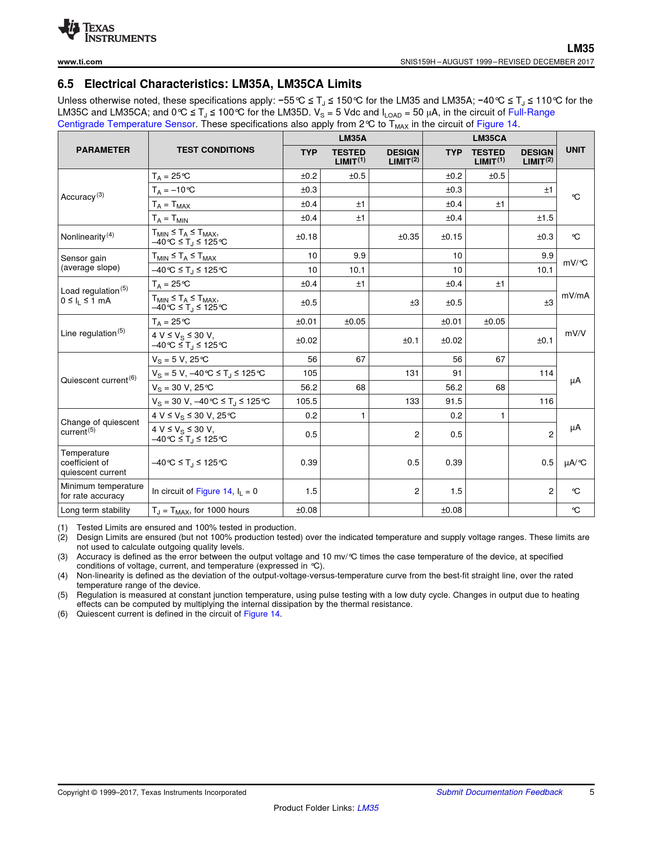 LM35. www.ti.com. 6.5 Electrical Characteristics: LM35A, LM35CA Limits. LM35A. LM35CA. PARAMETER. TEST CONDITIONS. UNIT. TYP. TESTED