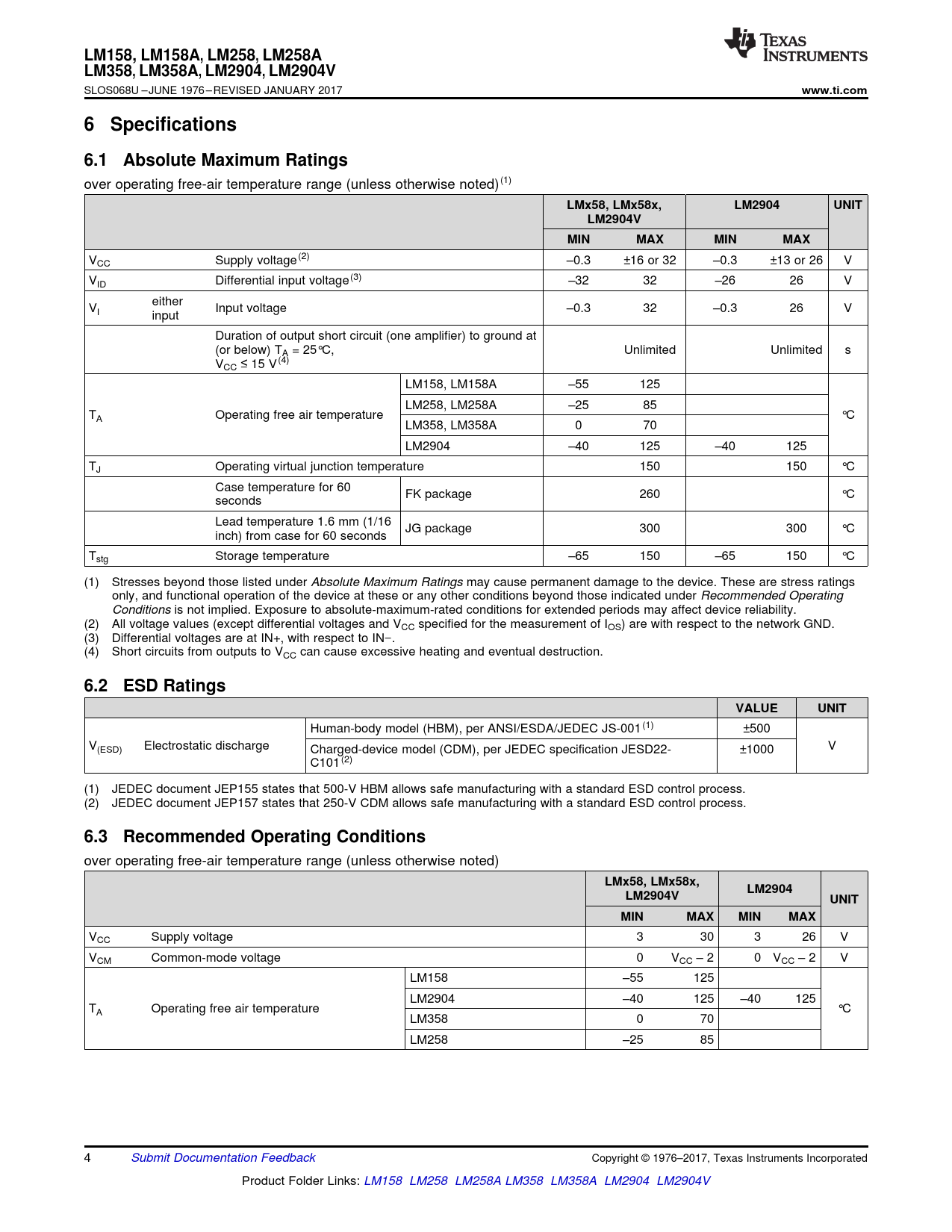 VCC Supply voltage(2) –0.3 ±16 or 32 –0.3 ±13 or 26 V VID Differential input voltage(3) –32 32 –26 26 V either VI Input voltage –0.3 32 –0.3 26 V input Duration of output short circuit (one amplifier) to ground at (or below) TA = 25°C, Unlimited Unlimited s VCC ≤ 15 V(4) LM158, LM158A –55 125 LM258, LM258A –25 85 TA Operating free air temperature °C LM358, LM358A 0 70 LM2904 –40 125 –40 125 TJ Operating virtual junction temperature 150 150 °C Case temperature for 60 FK package 260 °C seconds Lead temperature 1.6 mm (1/16 JG package 300 300 °C inch) from case for 60 seconds Tstg Storage temperature –65 150 –65 150 °C (1) Stresses beyond those listed under Absolute Maximum Ratings may cause permanent damage to the device. These are stress ratings only, and functional operation of the device at these or any other conditions beyond those indicated under Recommended Operating Conditions is not implied. Exposure to absolute-maximum-rated conditions for extended periods may affect device reliability. (2) All voltage values (except differential voltages and VCC specified for the measurement of IOS) are with respect to the network GND. (3) Differential voltages are at IN+, with respect to IN−. (4) Short circuits from outputs to VCC can cause excessive heating and eventual destruction.