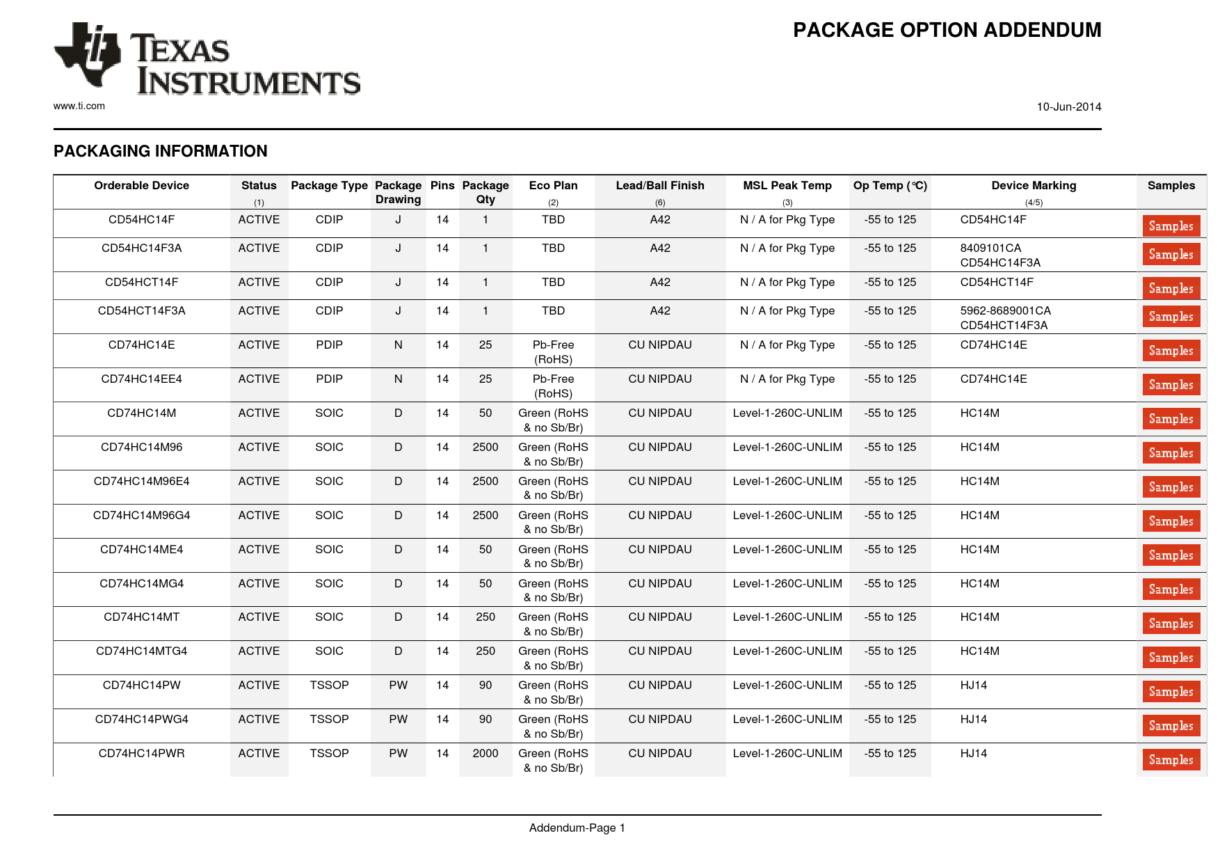(2) (6) (3) (4/5) CD54HC14F ACTIVE CDIP J 14 1 TBD A42 N / A for Pkg Type -55 to 125 CD54HC14F CD54HC14F3A ACTIVE CDIP J 14 1 TBD A42 N / A for Pkg Type -55 to 125 8409101CA CD54HC14F3A CD54HCT14F ACTIVE CDIP J 14 1 TBD A42 N / A for Pkg Type -55 to 125 CD54HCT14F CD54HCT14F3A ACTIVE CDIP J 14 1 TBD A42 N / A for Pkg Type -55 to 125 5962-8689001CA CD54HCT14F3A CD74HC14E ACTIVE PDIP N 14 25 Pb-Free CU NIPDAU N / A for Pkg Type -55 to 125 CD74HC14E (RoHS) CD74HC14EE4 ACTIVE PDIP N 14 25 Pb-Free CU NIPDAU N / A for Pkg Type -55 to 125 CD74HC14E (RoHS) CD74HC14M ACTIVE SOIC D 14 50 Green (RoHS CU NIPDAU Level-1-260C-UNLIM -55 to 125 HC14M & no Sb/Br) CD74HC14M96 ACTIVE SOIC D 14 2500 Green (RoHS CU NIPDAU Level-1-260C-UNLIM -55 to 125 HC14M & no Sb/Br) CD74HC14M96E4 ACTIVE SOIC D 14 2500 Green (RoHS CU NIPDAU Level-1-260C-UNLIM -55 to 125 HC14M & no Sb/Br) CD74HC14M96G4 ACTIVE SOIC D 14 2500 Green (RoHS CU NIPDAU Level-1-260C-UNLIM -55 to 125 HC14M & no Sb/Br) CD74HC14ME4 ACTIVE SOIC D 14 50 Green (RoHS CU NIPDAU Level-1-260C-UNLIM -55 to 125 HC14M & no Sb/Br) CD74HC14MG4 ACTIVE SOIC D 14 50 Green (RoHS CU NIPDAU Level-1-260C-UNLIM -55 to 125 HC14M & no Sb/Br) CD74HC14MT ACTIVE SOIC D 14 250 Green (RoHS CU NIPDAU Level-1-260C-UNLIM -55 to 125 HC14M & no Sb/Br) CD74HC14MTG4 ACTIVE SOIC D 14 250 Green (RoHS CU NIPDAU Level-1-260C-UNLIM -55 to 125 HC14M & no Sb/Br) CD74HC14PW ACTIVE TSSOP PW 14 90 Green (RoHS CU NIPDAU Level-1-260C-UNLIM -55 to 125 HJ14 & no Sb/Br) CD74HC14PWG4 ACTIVE TSSOP PW 14 90 Green (RoHS CU NIPDAU Level-1-260C-UNLIM -55 to 125 HJ14 & no Sb/Br) CD74HC14PWR ACTIVE TSSOP PW 14 2000 Green (RoHS CU NIPDAU Level-1-260C-UNLIM -55 to 125 HJ14 & no Sb/Br) Addendum-Page 1